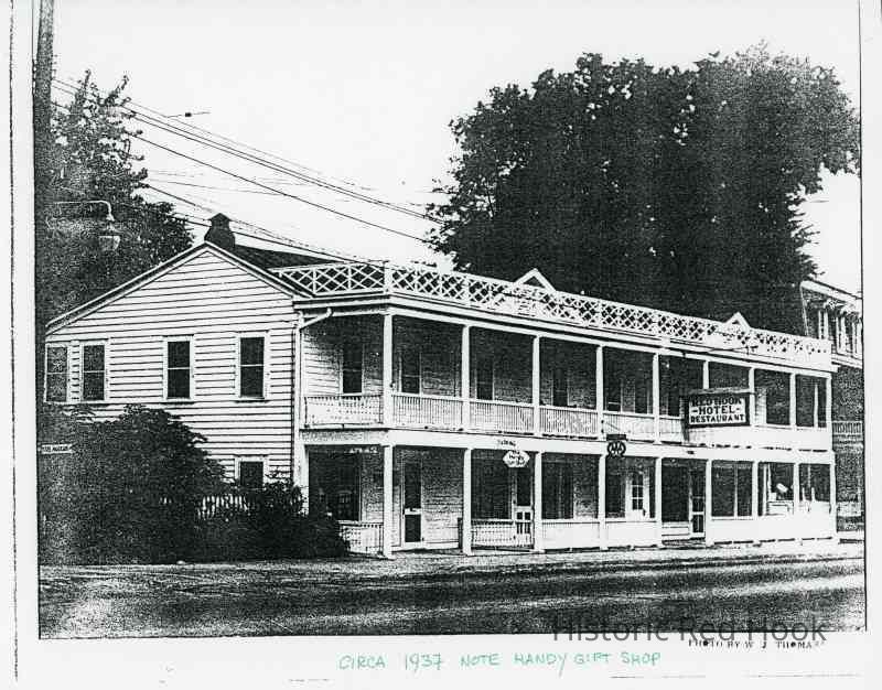 Photocopy of Red Hook Hotel exterior, c 1937 with signs for Handy Gift Shop and Red Hook Hotel Restaurant.Photograph Details
