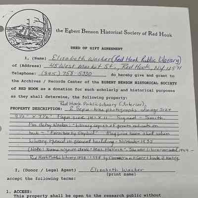 Sepia photos - two views of interior of Red Hook Library, circa 1930s. Signed I. Smith. Per Betsy Wacker " Library copies of prints indicate on back "Furniture by Gaylord'' May have been shot when libary opened in present building - November,1935. Name sign on desk reads "Mrs. Hallock" - she was librarian until 1949.Photograph Details