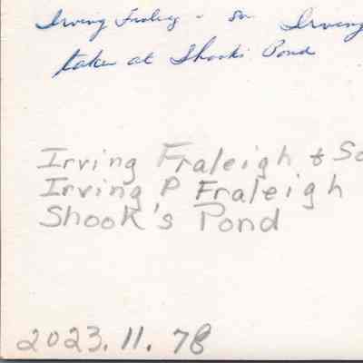 An informal photograph of Irving Fraleigh with his son Irving Peter at Hooks Pond.Photograph Details