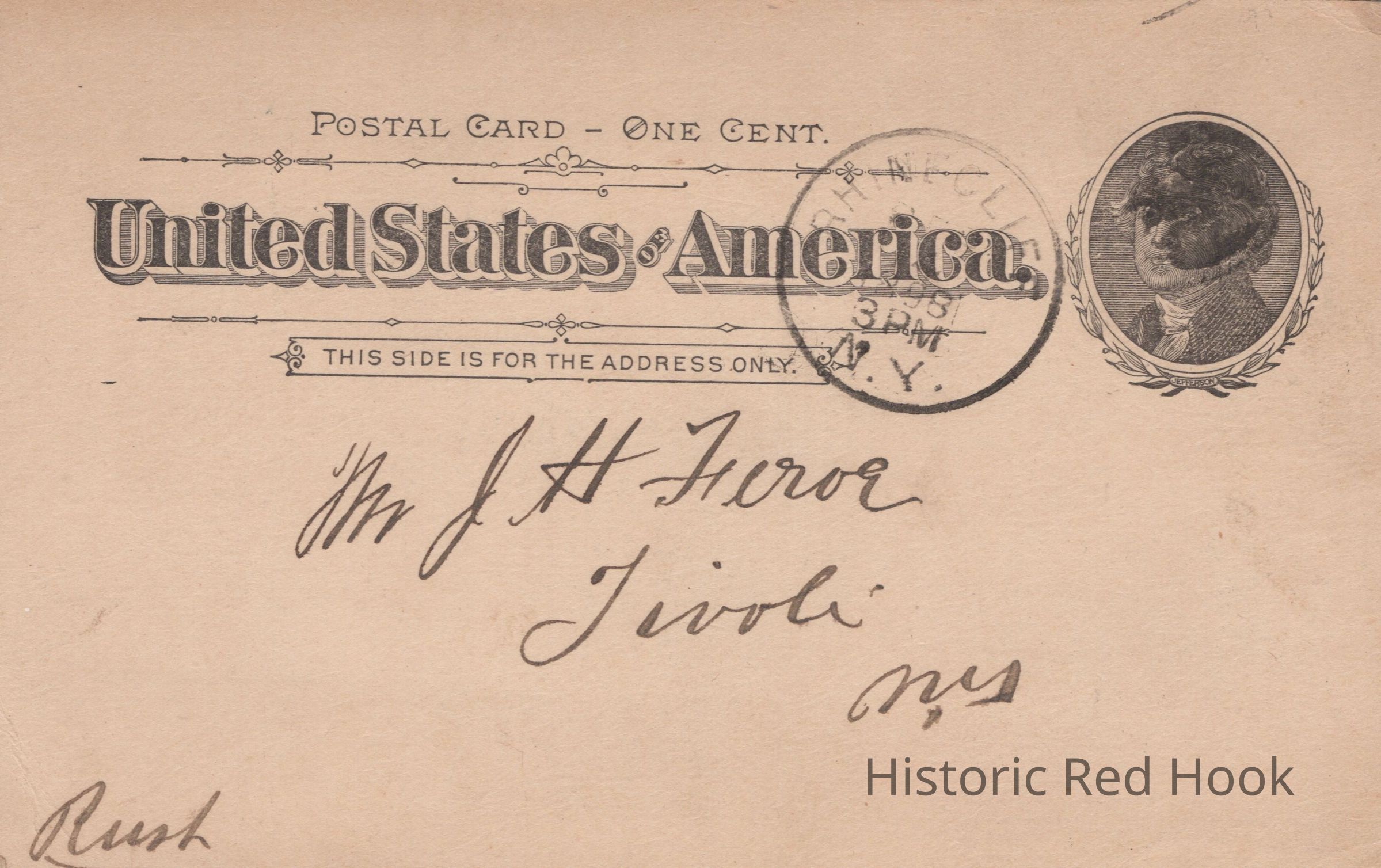 A postcard sent to Mr. J.H. Feroe, Tivoli NY, informing him that a shipment of apples had been left at Ulster Landing the previous evening and were being sent ahead that night. Postmarked Rhinecliff, NY and marked "Rush".Collection