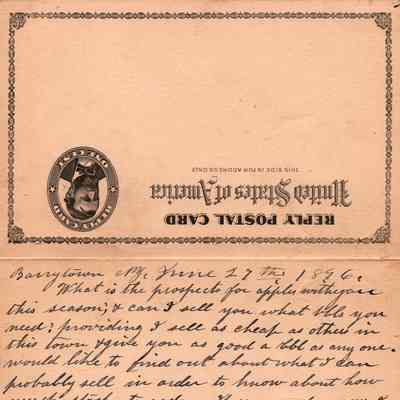 Postcard with paid reply postcard addressed to D. H. Vosburgh, Red Hook, NY from I. Snyder, at Barrytown, New York dated June 27, 1896 regarding a purchase of apples that season with a reciprocal sale of barrels.Collection