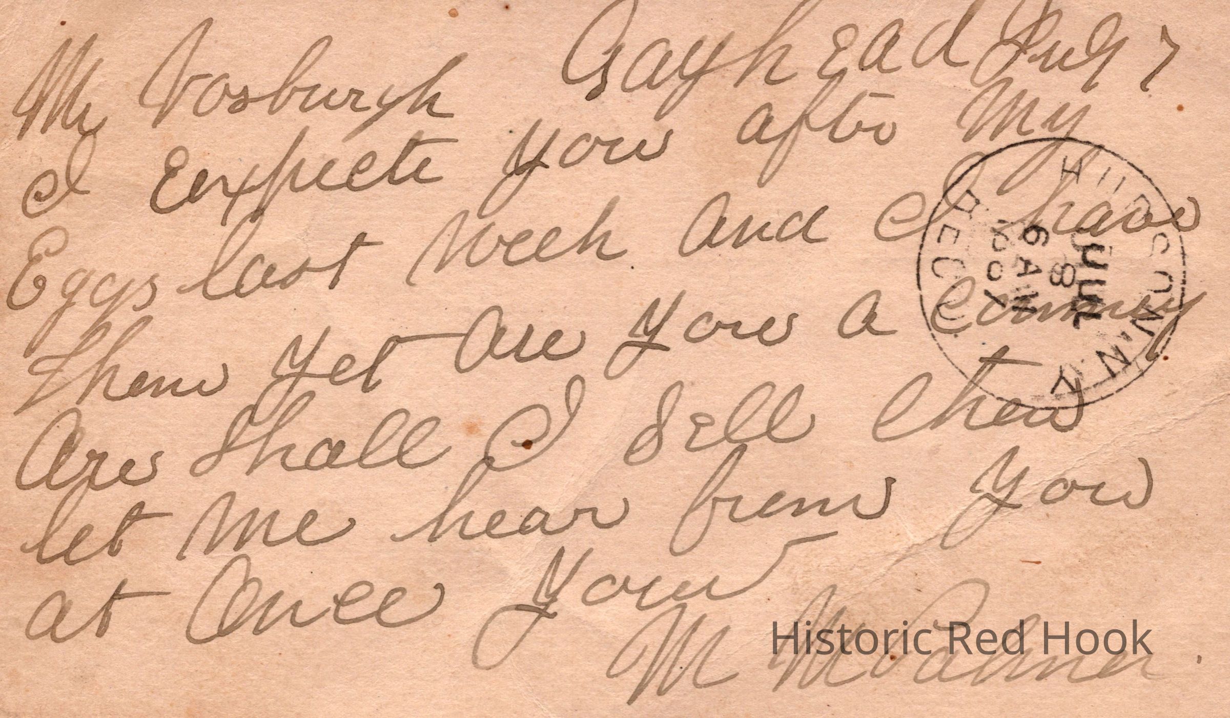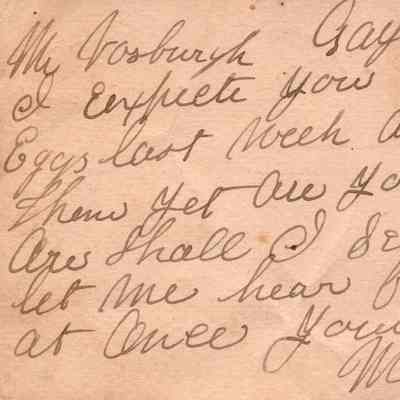 A postcard addressed to Vosburgh Eggs Dealer at Hudson, New York from M. Palmer regarding a request for the purchase of eggs.Collection