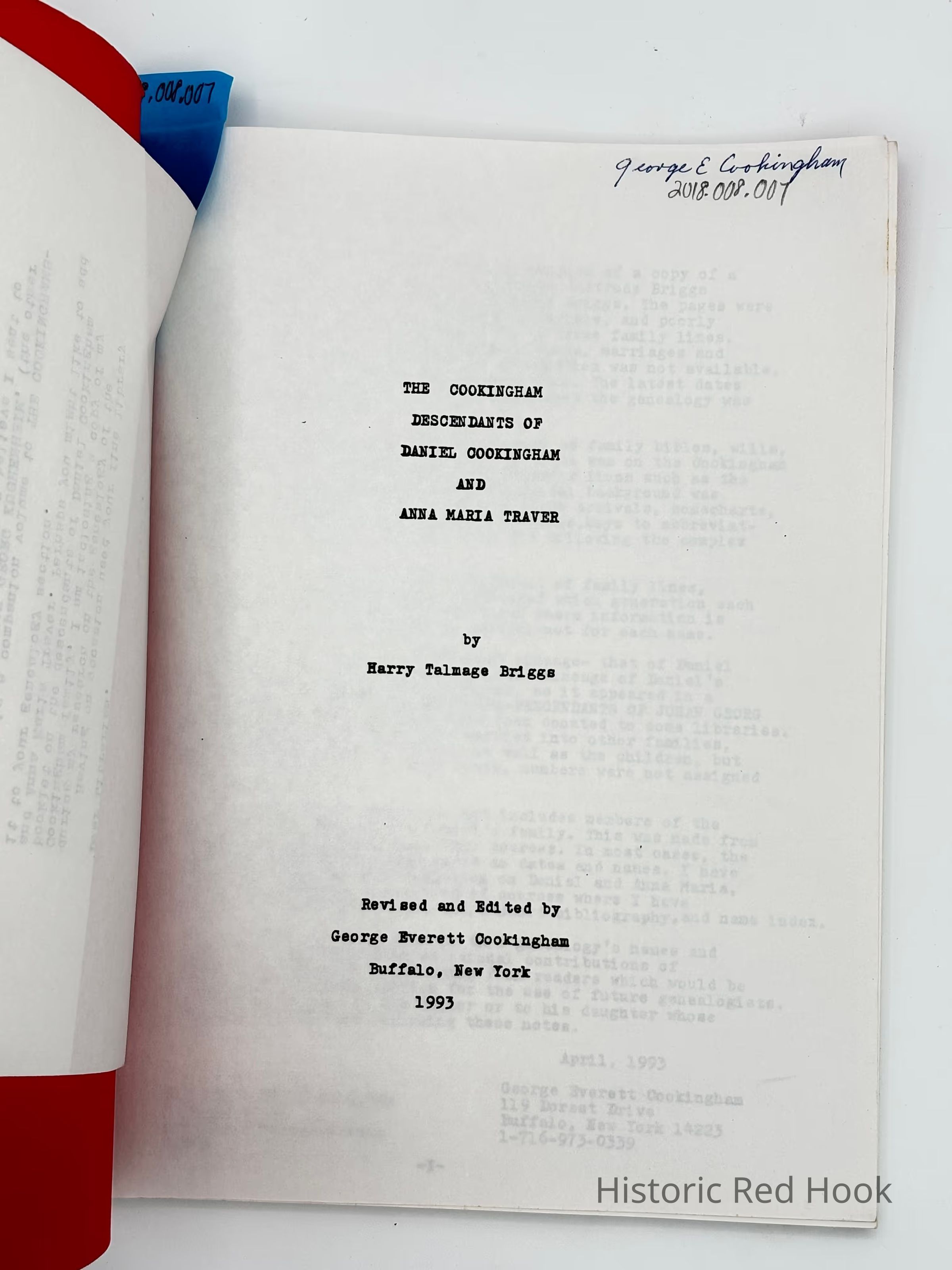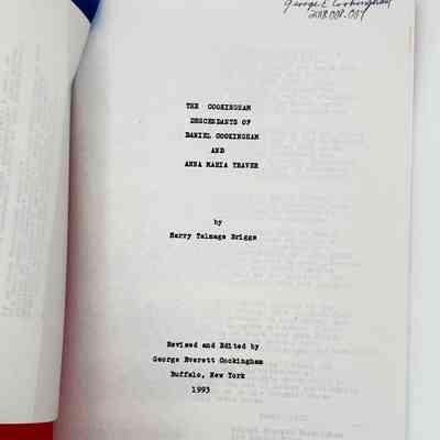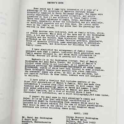 This 27 page paper bound booklet focuses on the Cookingham family lineage, "that of Daniel Cookingham and Anna Maria Traver." Starting with the arrival of the Cookinghams from the Palatinate area of Germany, about 1737 or 1753 depending on the source, it follows the growing family as members settled in Dutchess county, NY. and eventually to other adjacent counties. A general history of the Palatines is offered, as well as two timelines- one for the descendants of the Daniel Cookinghan-Anna Maria Traver family and the other for the Johan Georg Cookington-Anna Schmidt family. Multiple sources are listed including church records. A family tree is provided followed by a list of names.Collection