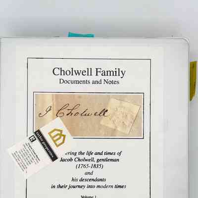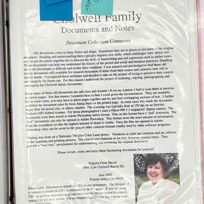 Loose-leaf notebook of genealogical information of the Cholwell family, compiled by Virginia Close Bacon in 2002.Collection