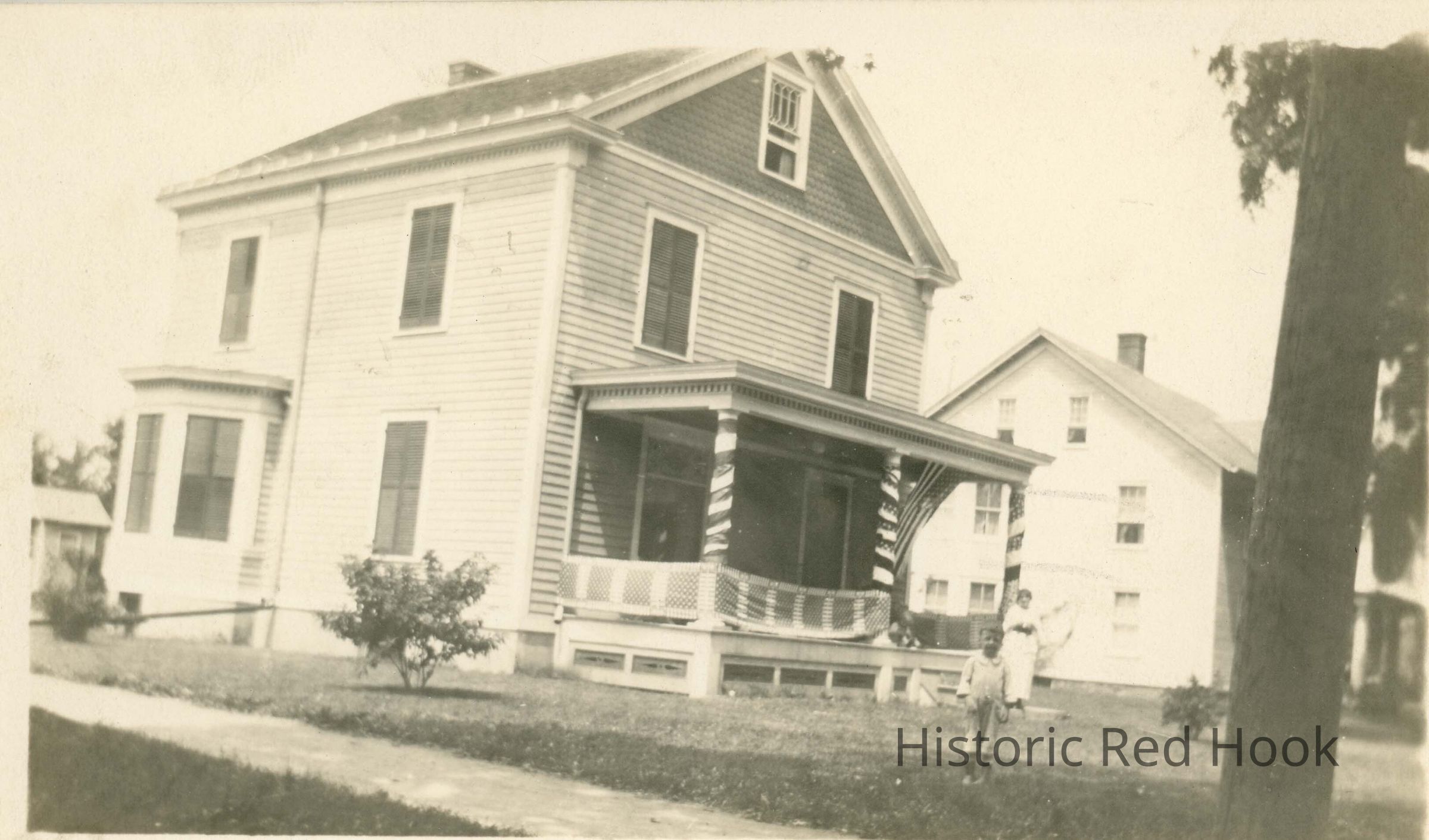 House, child and woman standing in front. 7557 North Broadway. Schutte house before bathroom addition on south side.Photograph Details