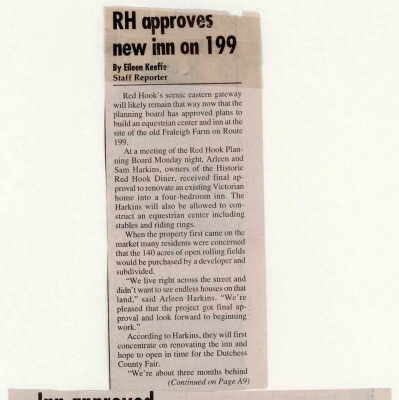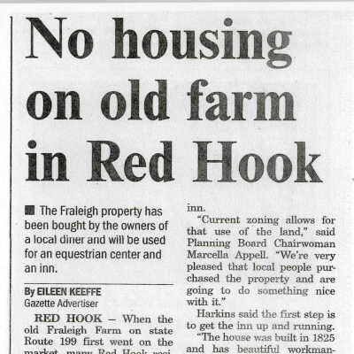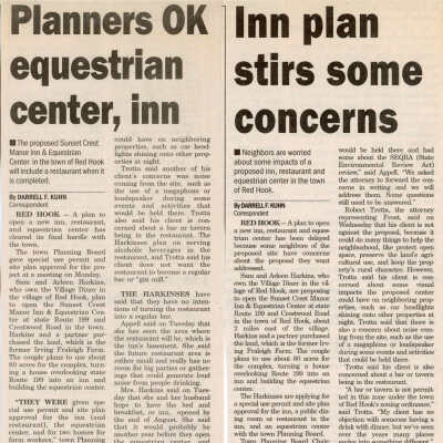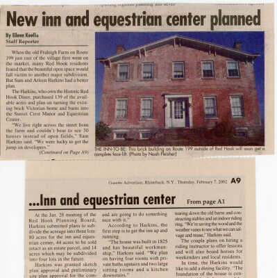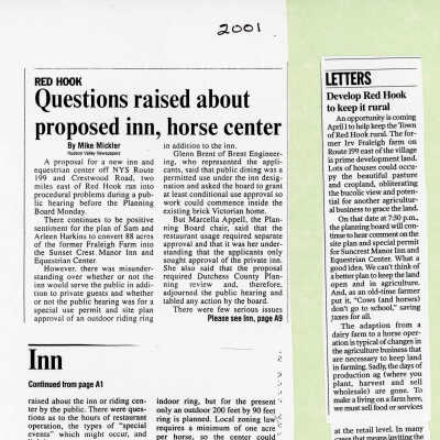 Clippings about equestrian center proposed by Sam and Arlene Harkins when they owned the former Irving Fraleigh Farm, 2001-2002.