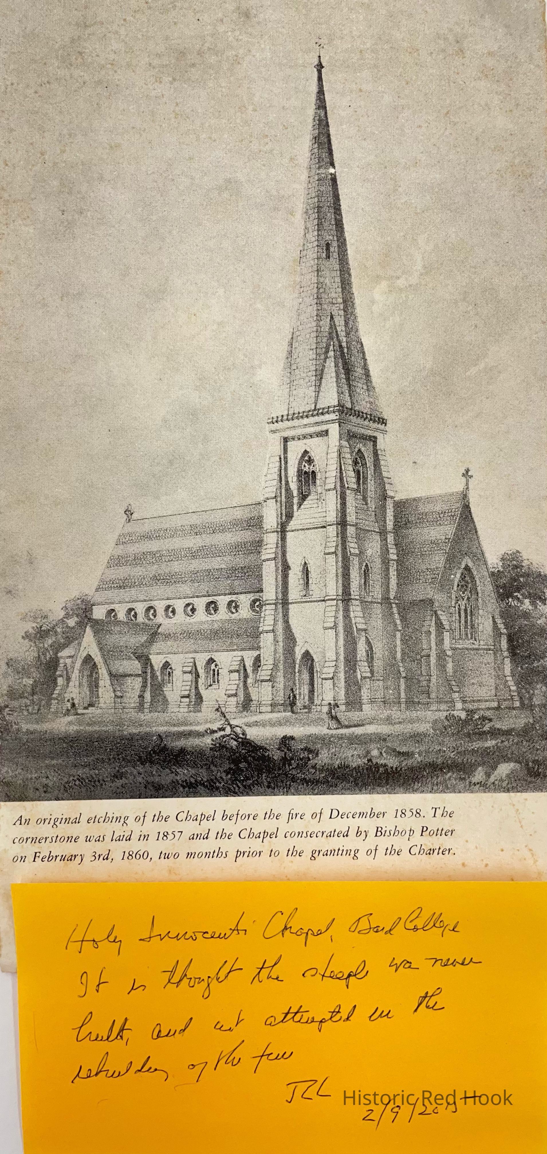 Copy of an etching of the Chapel as designed, with steeple. Note mentions that the steeple may never have been built before the fire