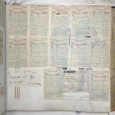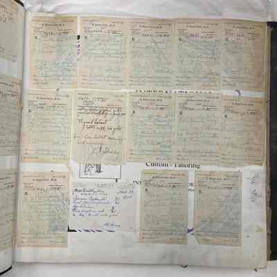 One leather bound fashion catalog, 19”H x 20” H x 2” D - ‘International Tailor Co, New York, Chicago, Montreal, Spring and Summer 1931, All Wool Line’ re-used as a prescription register. Prescriptions, 1933-1934, from local (many from L. Edward Cotter) and out-of-town doctors to local residents are pasted on the pages. Archie Paine is listed as pharmacist.Relationships