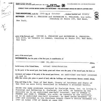 1987 and 1990 Deeds to Fraleigh Farm, splitting between Irving A.& Katherine Fraleigh and Donald L. & Jane F. FennerEntry/Object ID
