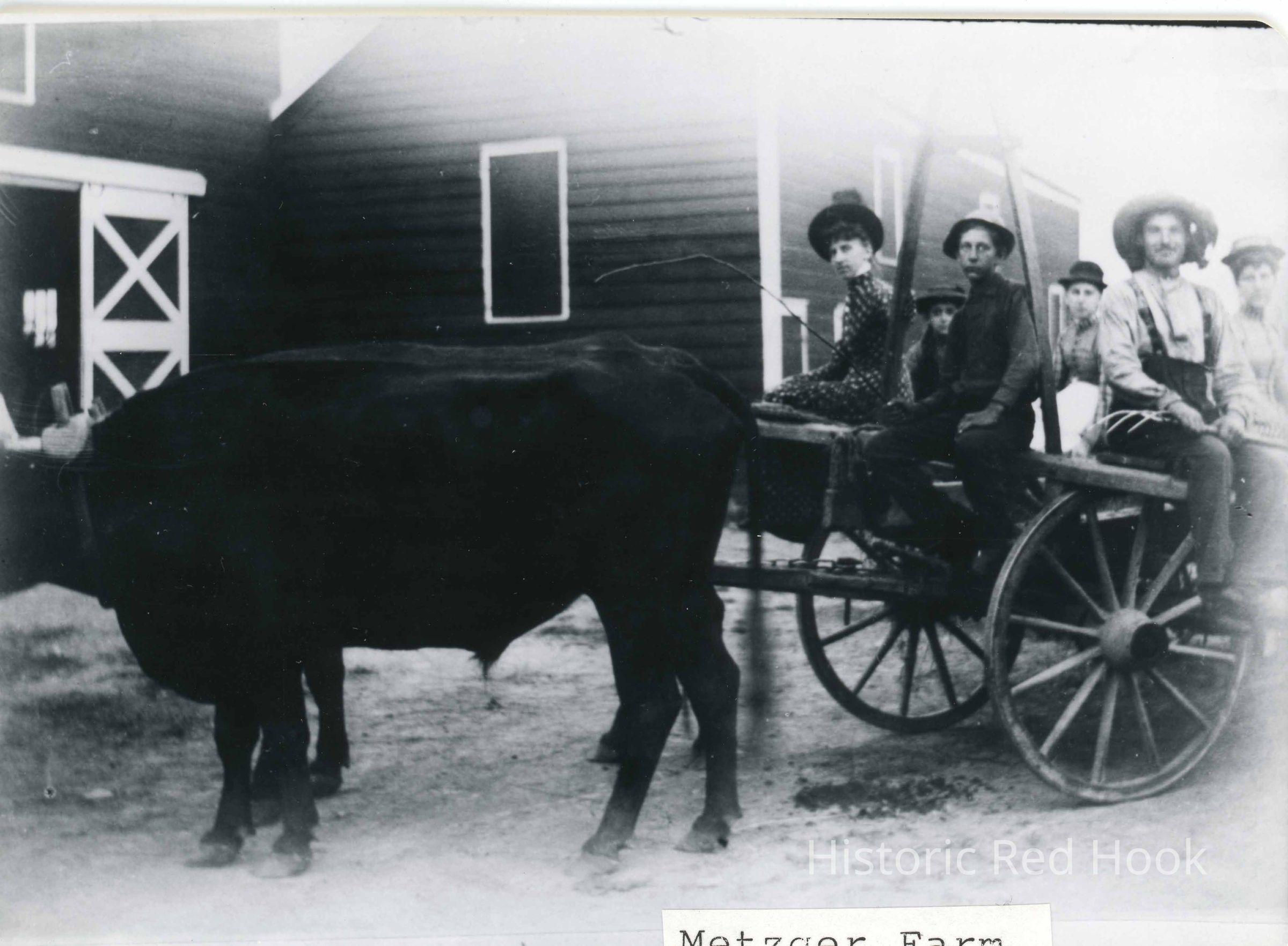 Group Photograph of a group seated in a wagon drawn by a bull identified as at Metzger FarmPhotograph Details