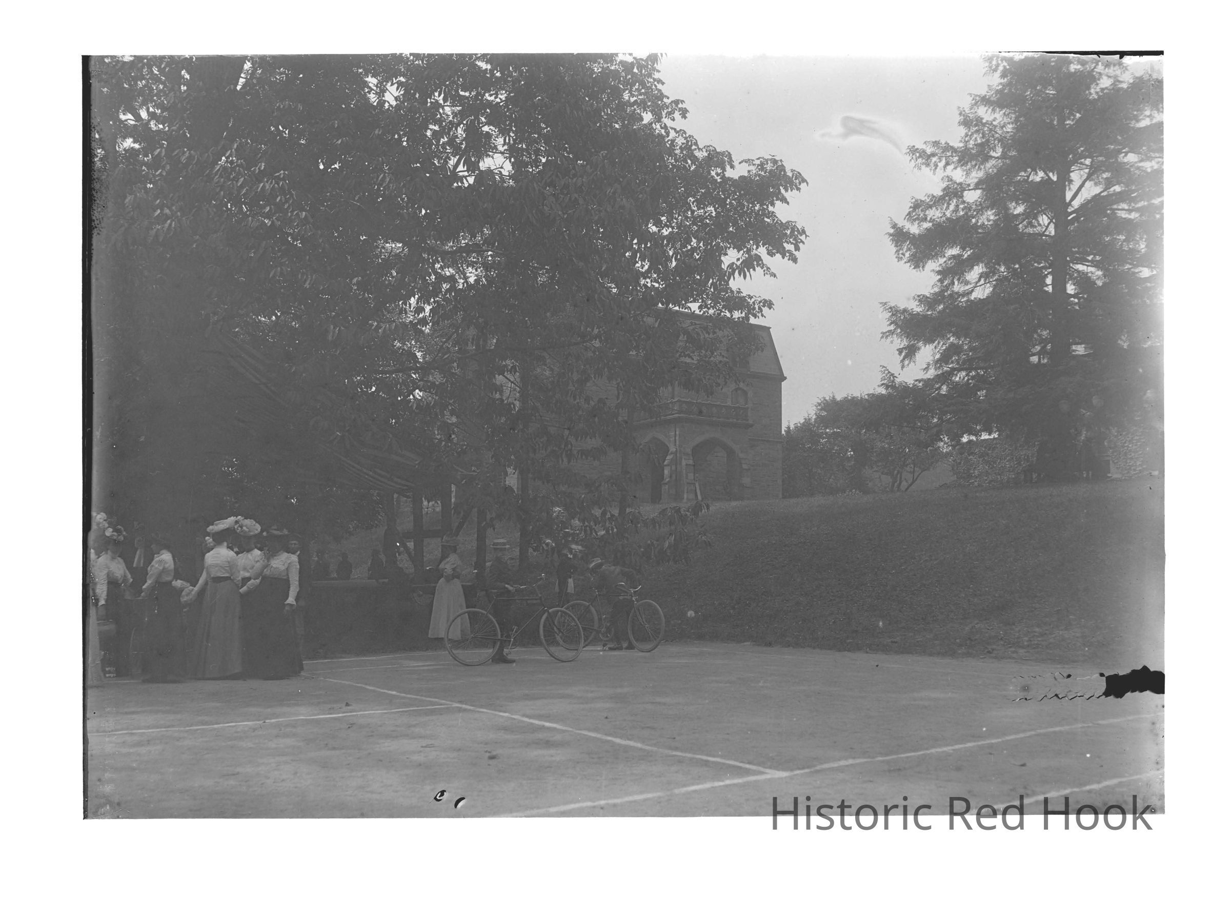 St Stephens College - Ward Manor in background? Women assembled on a court with bicycles.Photograph Details