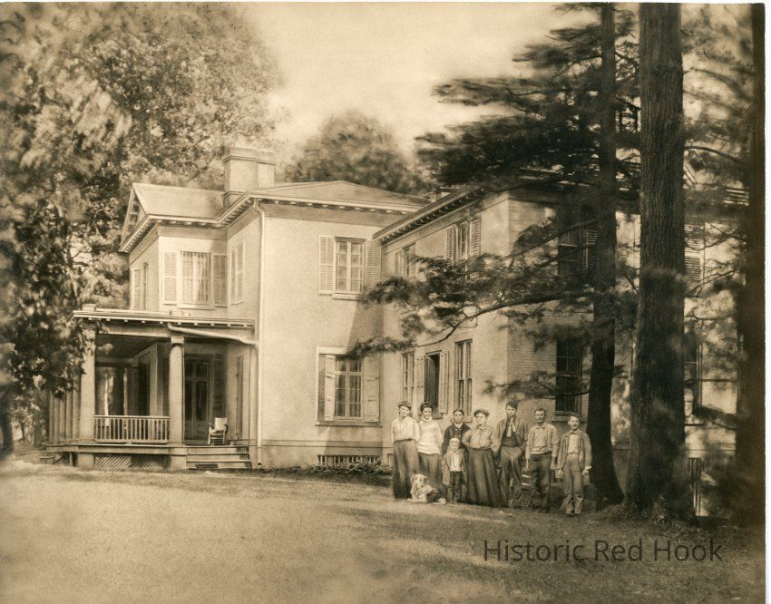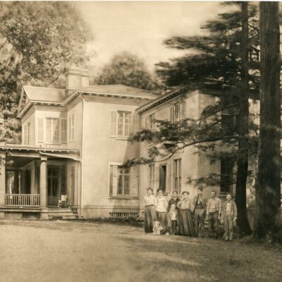 7 adults ("staff") standing outside with one child and a dog. Boy is probably George Renz whose father was the coachman.Photograph Details