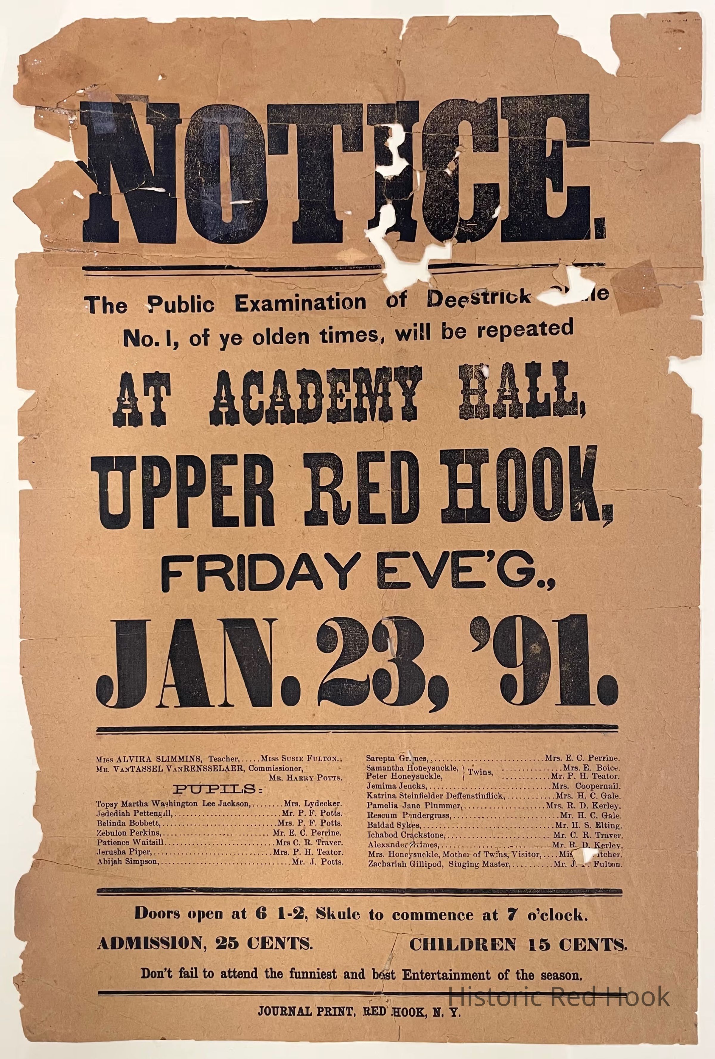 Broadside annuouncing performance at Academy Hall, Upper Red Hook, January 23, 1891. "The Public Examination of Deestrick Skule No 1, of ye olden times" with list of characters and performers.