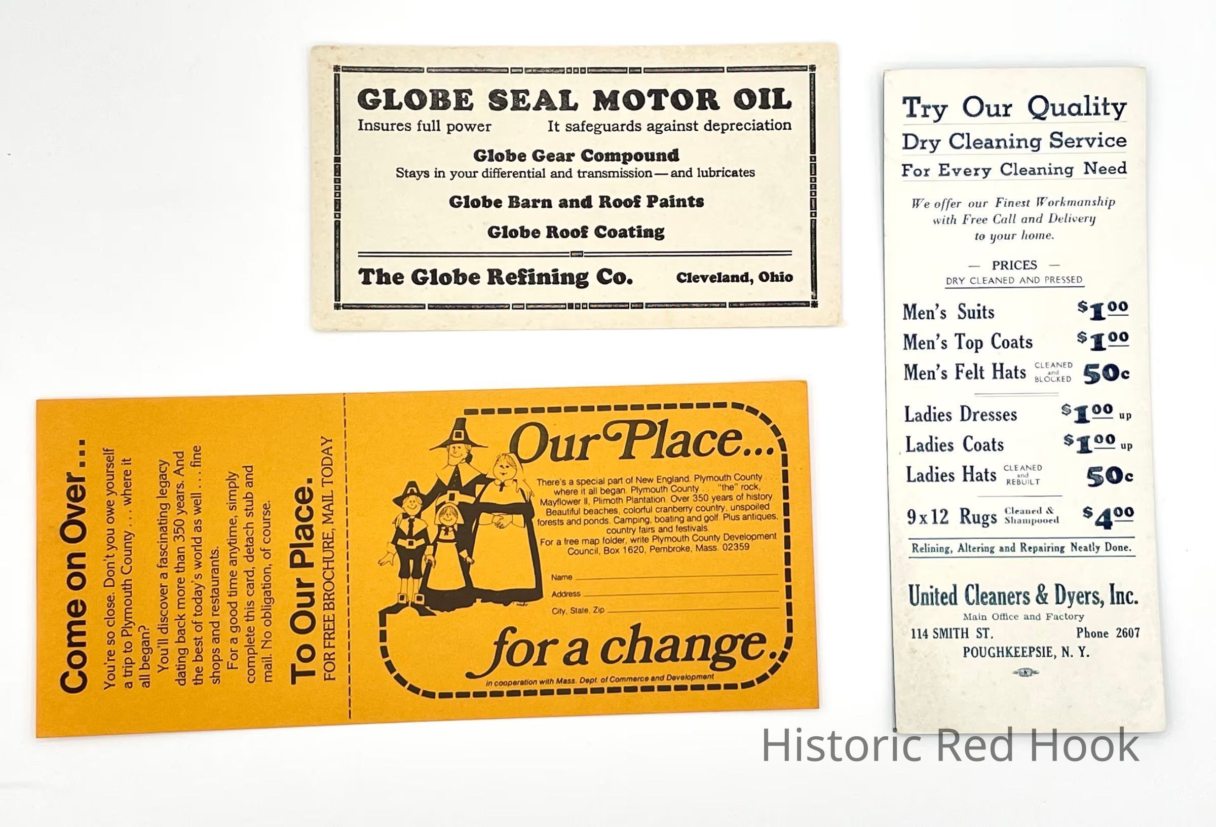 Three Advertising cards: - Globe Refining Co. - United Cleaners & Dyers, inc (Poughkeepsie) - Plymouth County