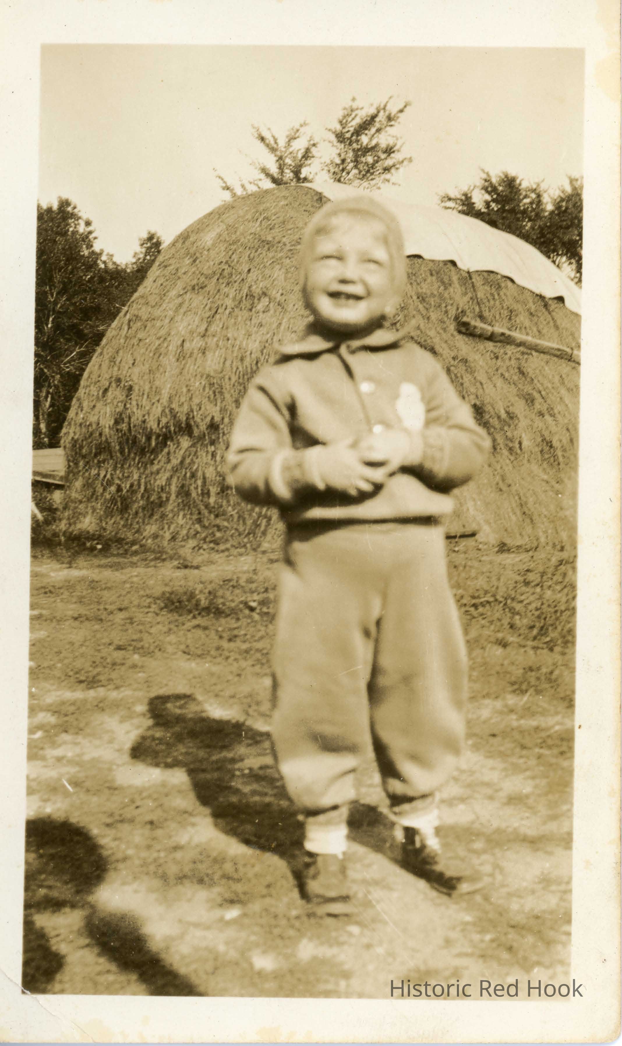 Margaret Riddleburgh Doty as a young girl in front of haystack.Photograph Details