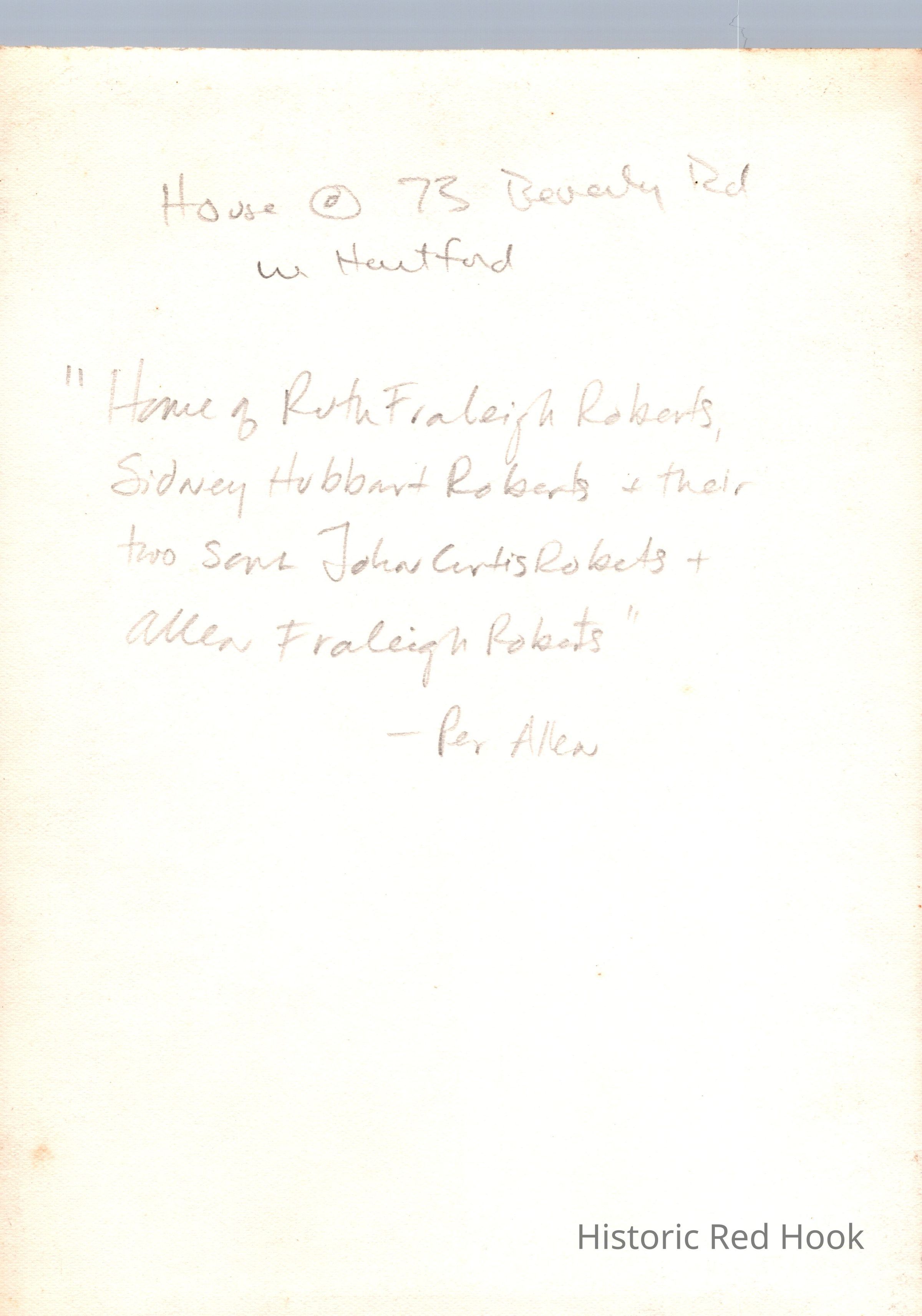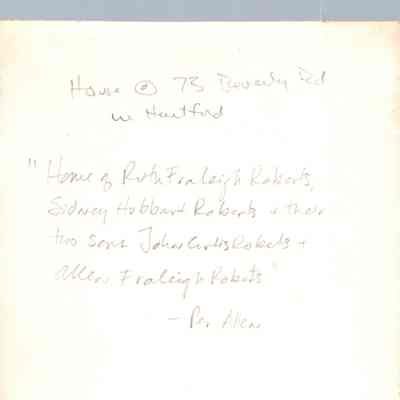 House at 73 Beverly Road in Hartford, home of Ruth Fraleigh Roberts, Sidney Hubbart Roberts and their two sons, John Curtis Roberts and Allen Fraleigh Roberts.Collection