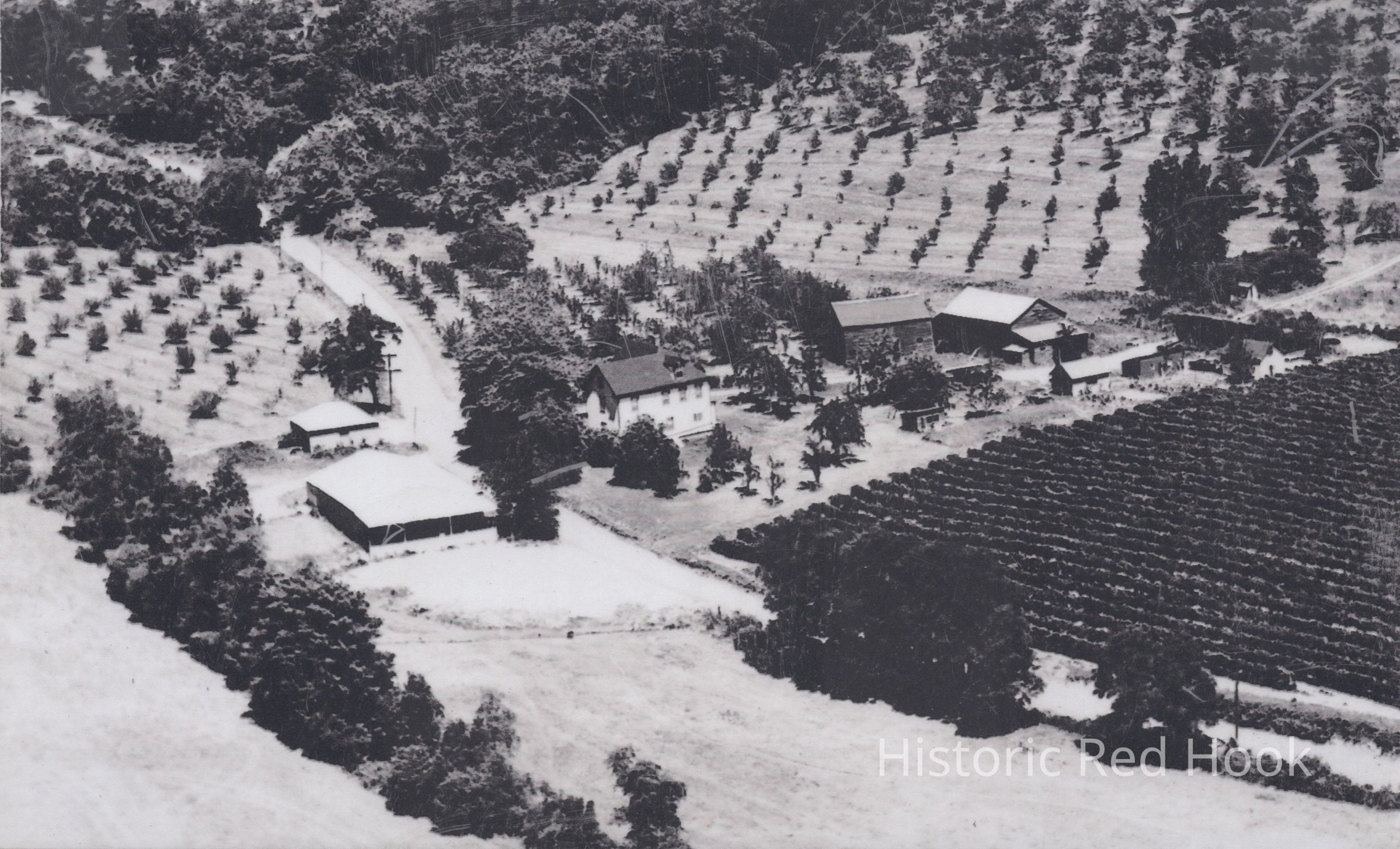 Aerial view of the Martin farm in Red Hook, NY, 1964