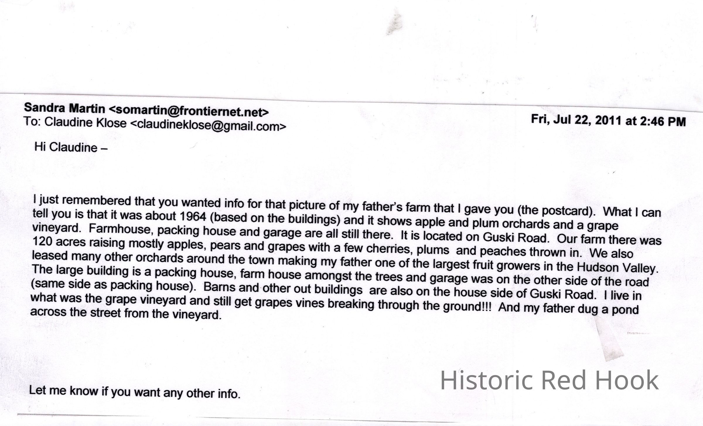Aerial view of the Martin farm on Guski Road in Red Hook, NY, 1964, with notes from Sandra Martin.