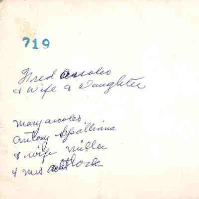 Group of people seated in a restaurant, identified on back of photo as"Fred Arcoleo (?) and wife and daughter, Mary Arcoleo, Antony Spalliana and wife Millie and Mrs. Autlock (?) Jenny Levoy,