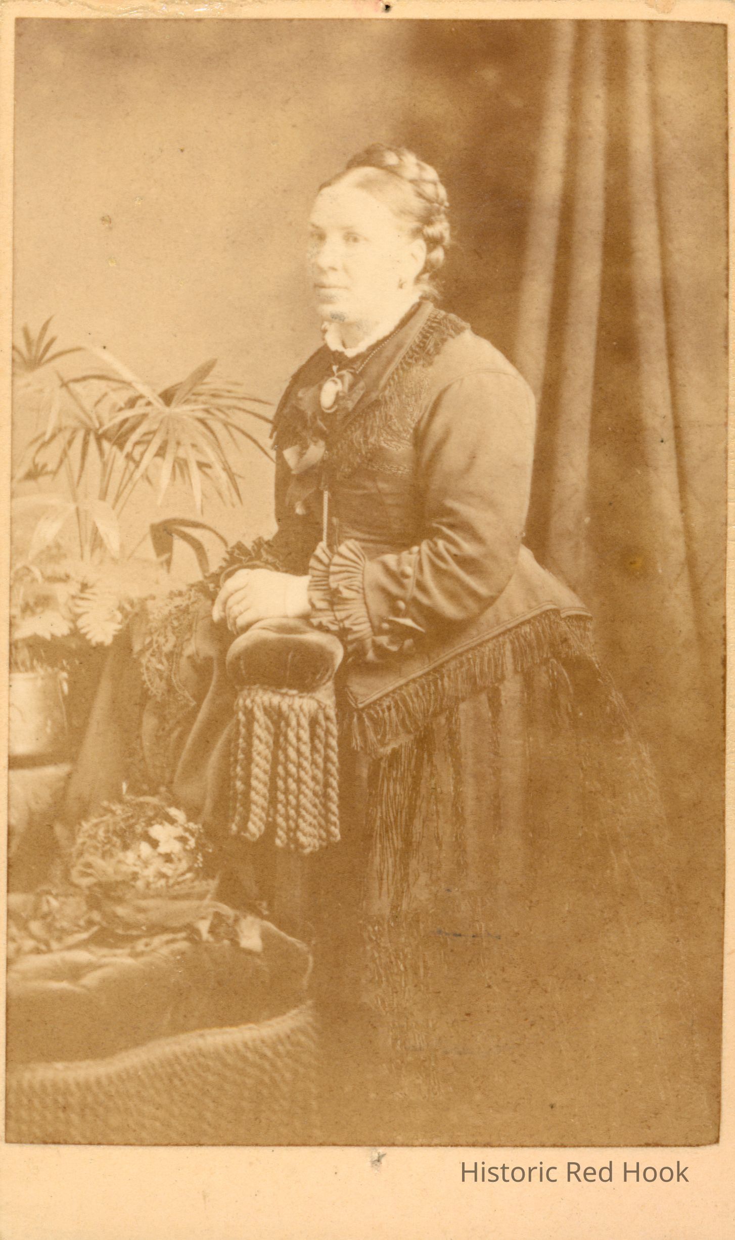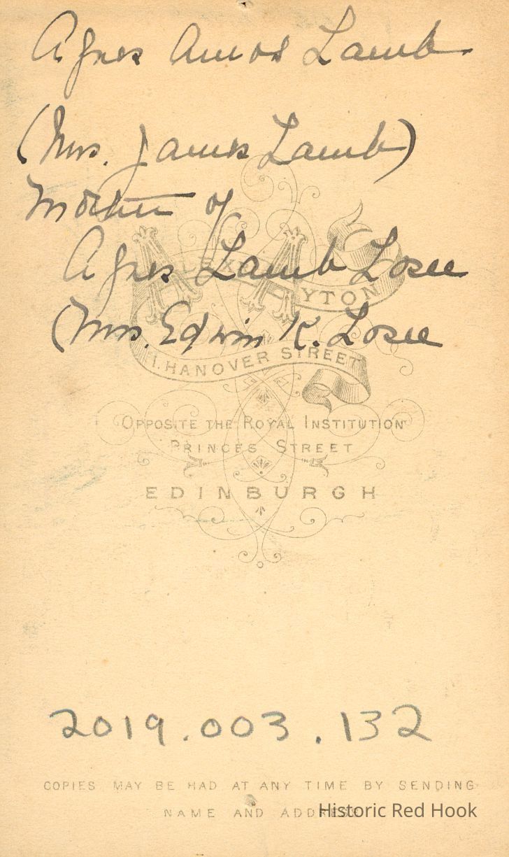 A formal Edinburgh studio portrait of a woman identified as Agnes A Lamb (Mrs. James Lamb) who was the mother of Agnes Lamb Losee (Mrs. Edwin K Losee).Photograph Details