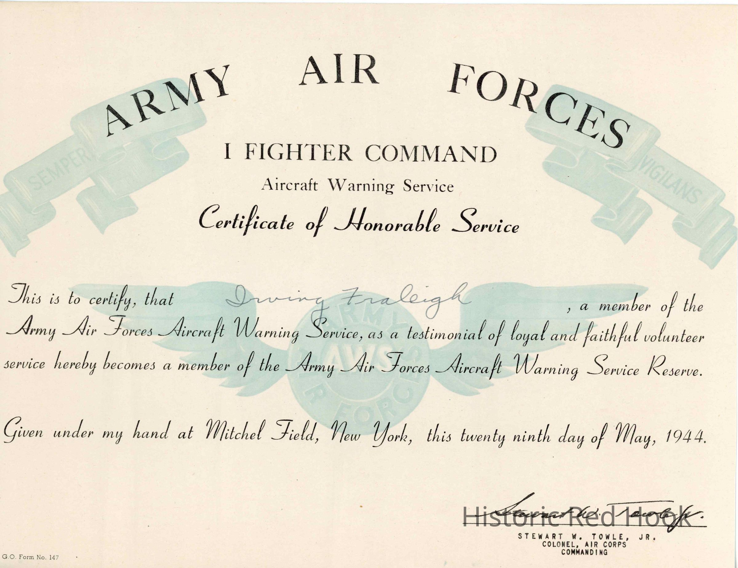 Air Force aircraft warning service certificate and correspondence, 1944, to Irving A. Fraleigh