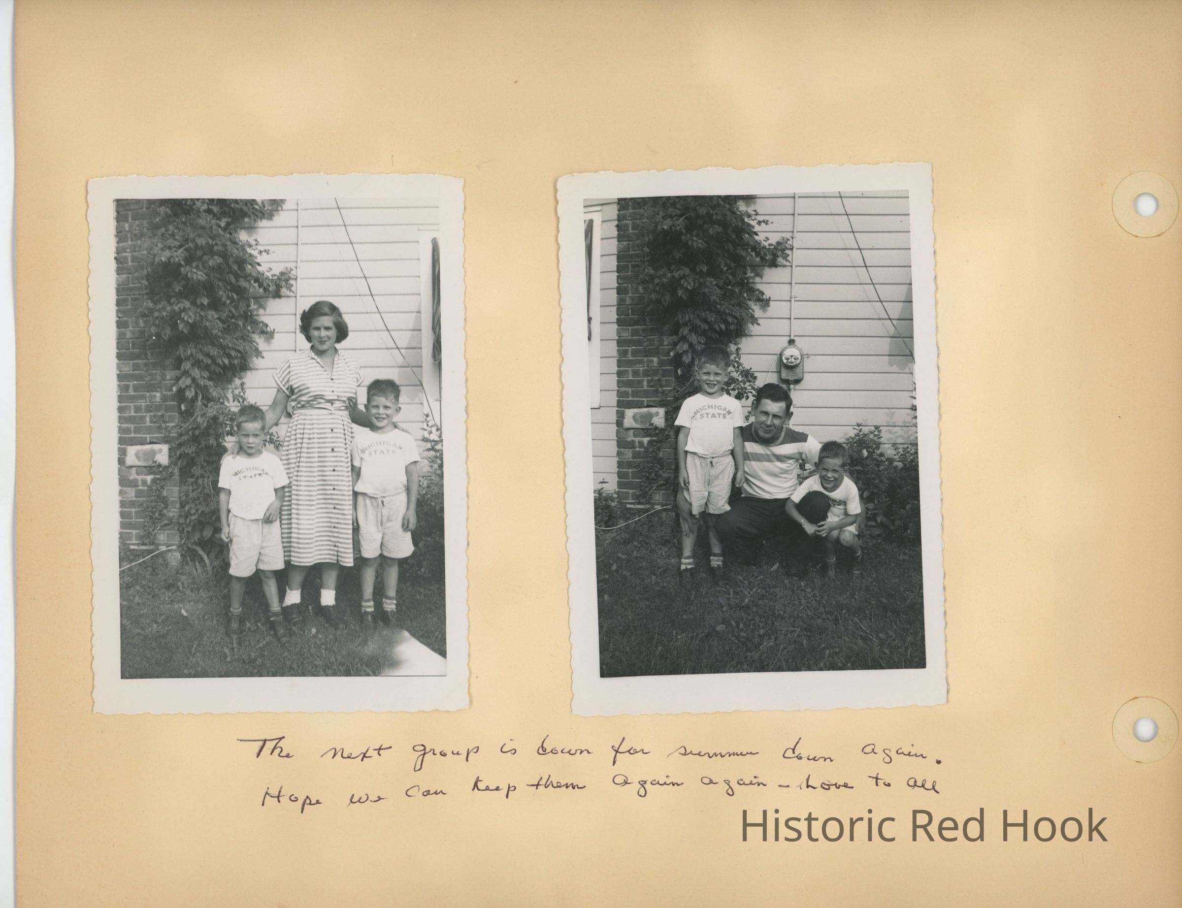 Two photos - Alice and Peter Bulkeley, owners of Heermance Farm, with sons, Peter and David. Written on scrapbook page "The next group is down for summer ? again. Hope we can keep them again.. Love to all.."Photograph Details
