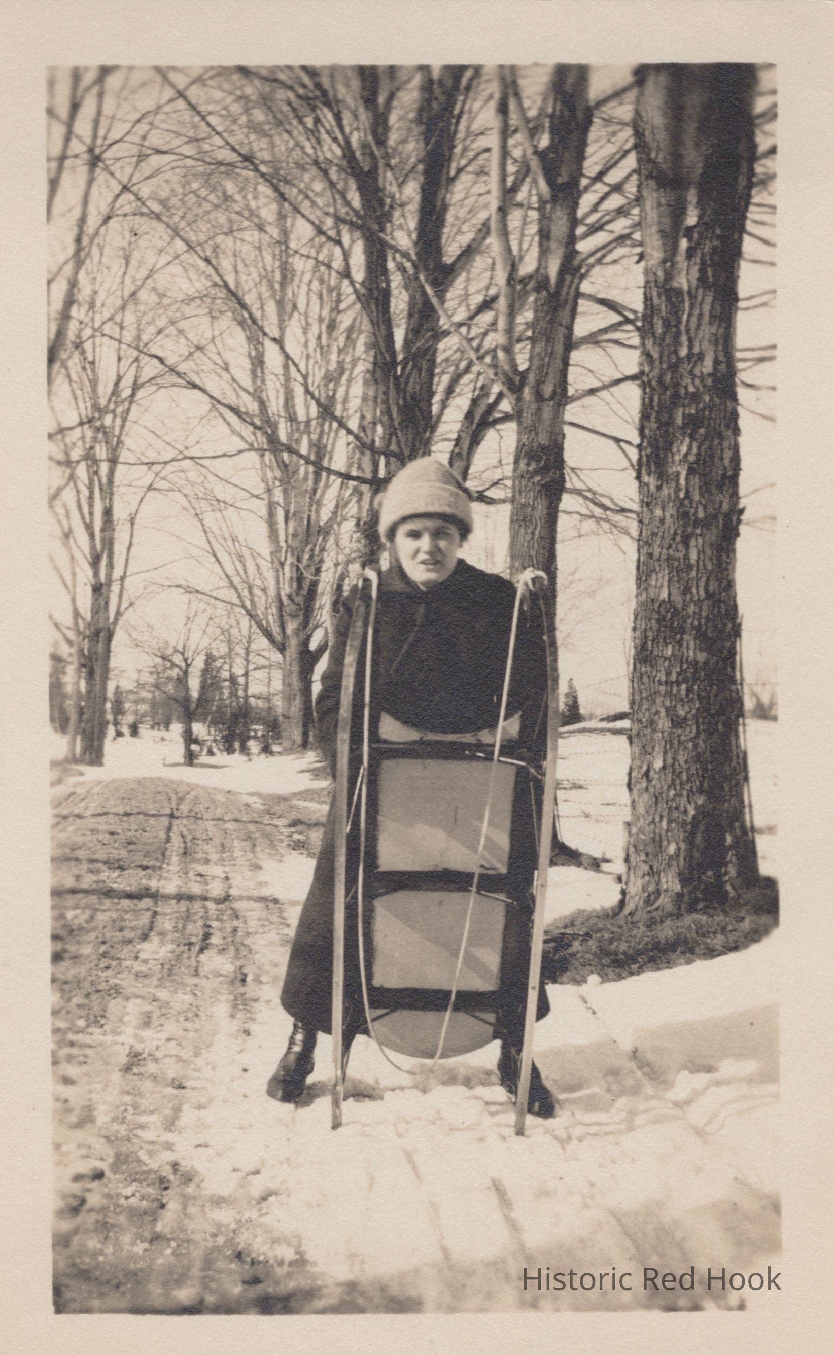 Alice Arnold Fraleigh with sled, 1916