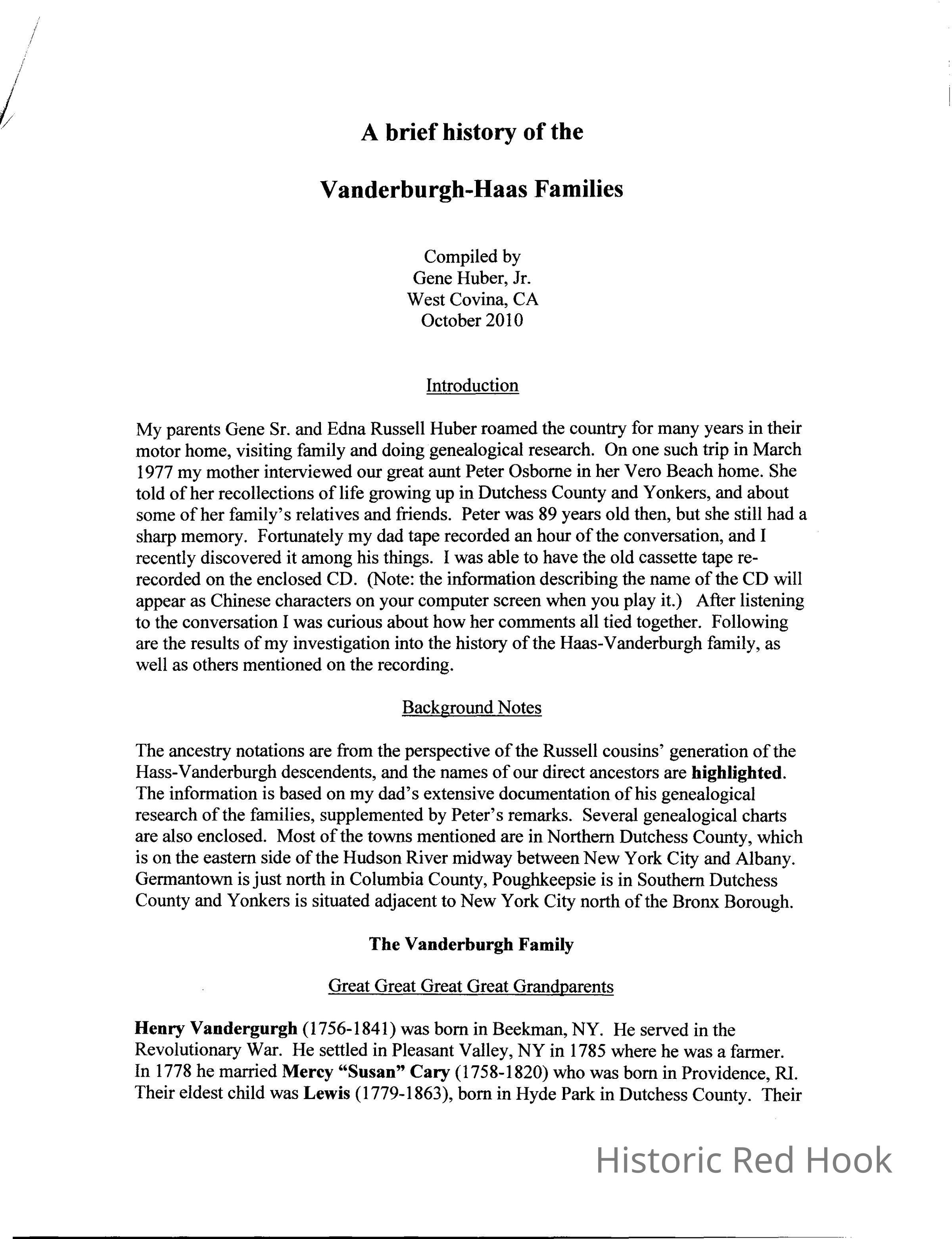 Research request, Brief History of Vanderburgh-Haas families and Red Hook Journal research, including information on Allendorph, Tremper and Stickle families.