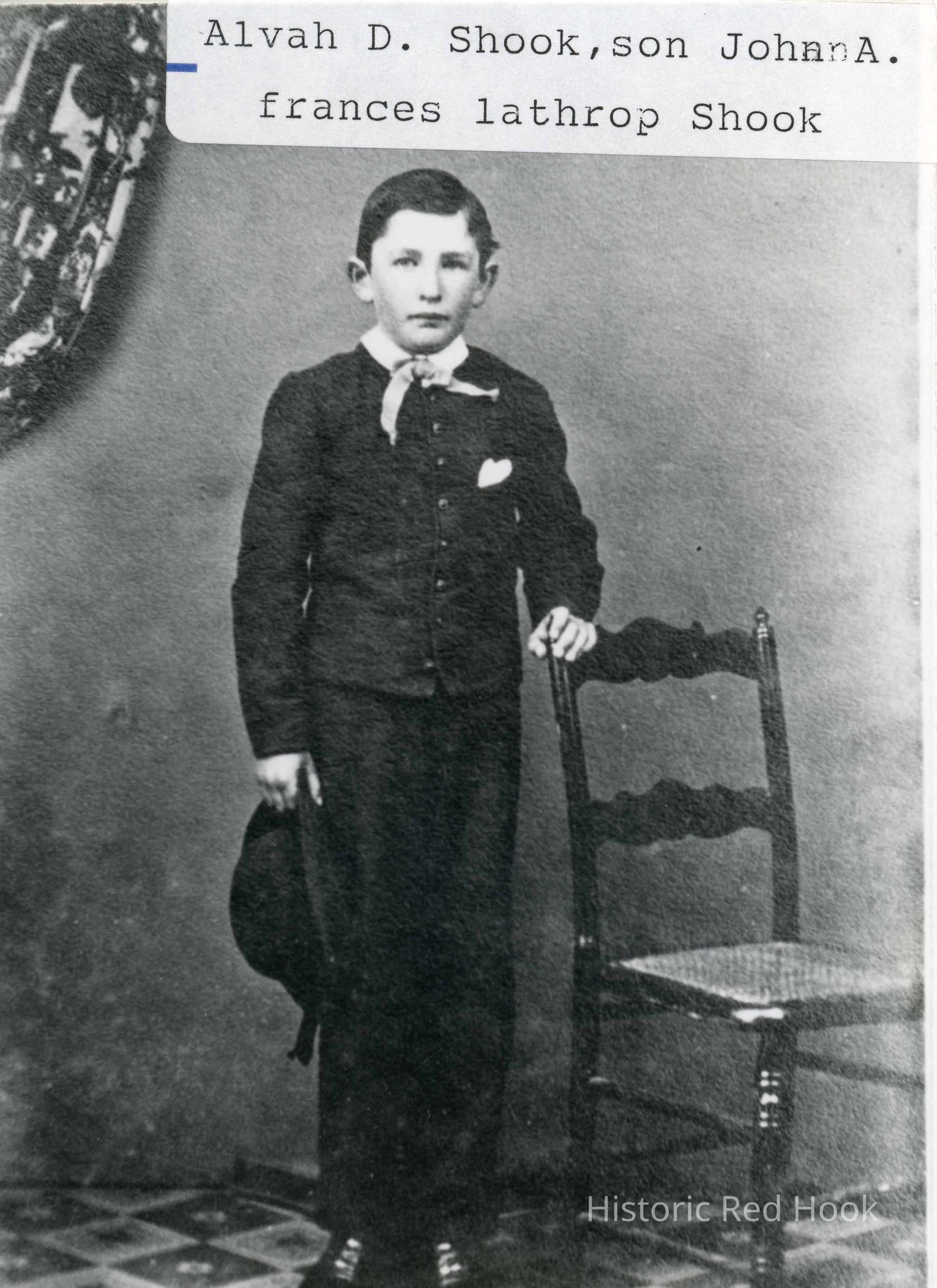 Formal portrait of a young boy standing near a chair with hat in hand identified as Alvah D. Shook, son of John A. and Frances Lathrop Shook.Photograph Details