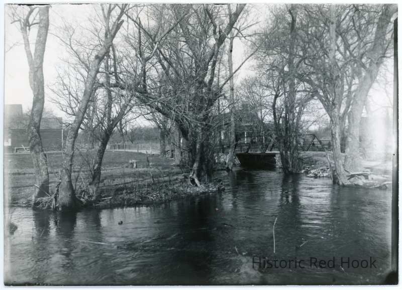 View from the south side of the bridge on what is now Echo Valley Road (from the Coons farm) across through the trees to original Teator stone house (now replaced). Dutch barn (still standing) is seen on the left. Road is dirt with barbed wire fencing along it. This image may be by W.S. Teator.Collection