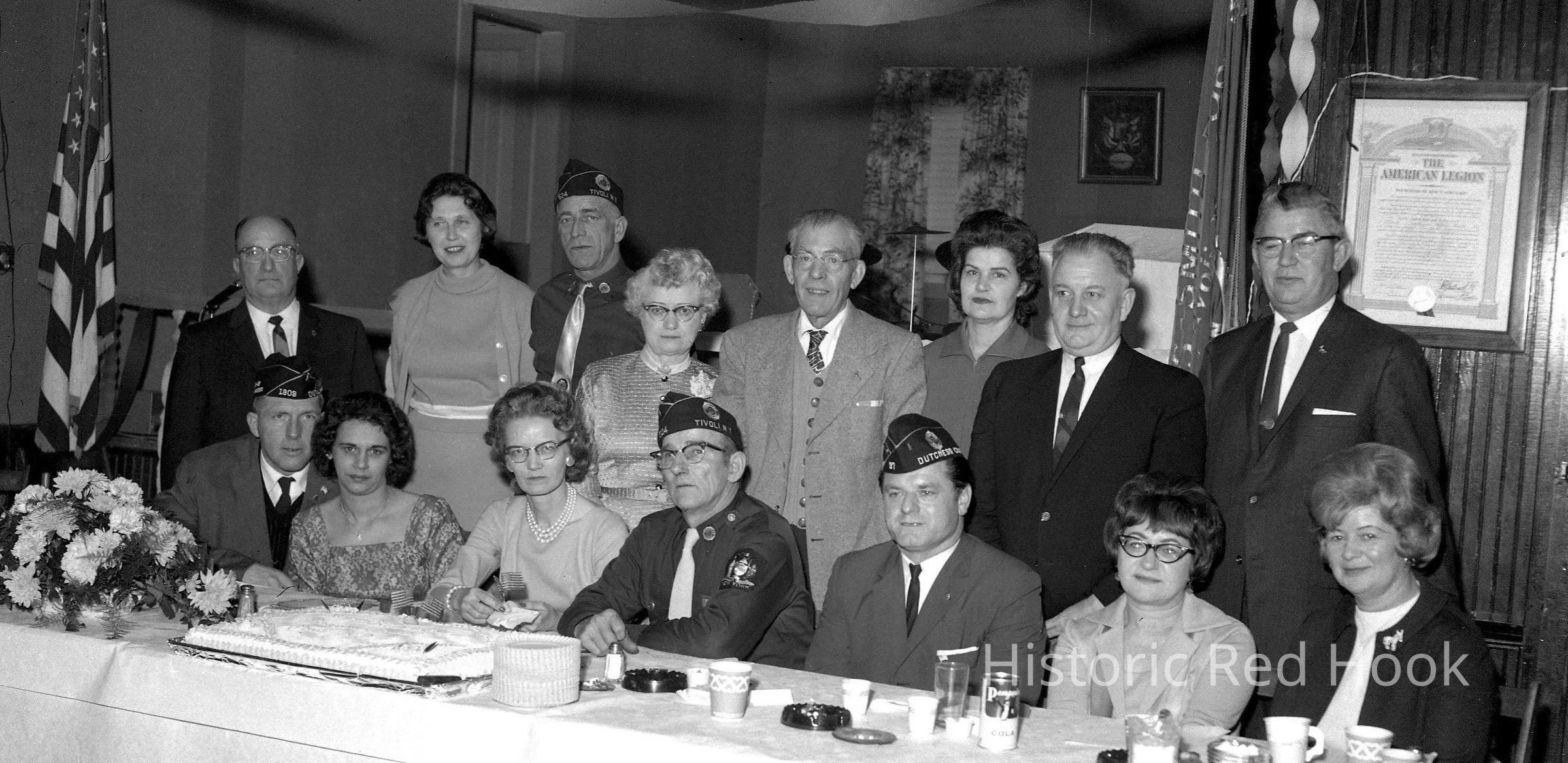 Group of people seated at a table with a large cake, celebrating the American Legion Post 524's 47th Birthday, 1965Collection