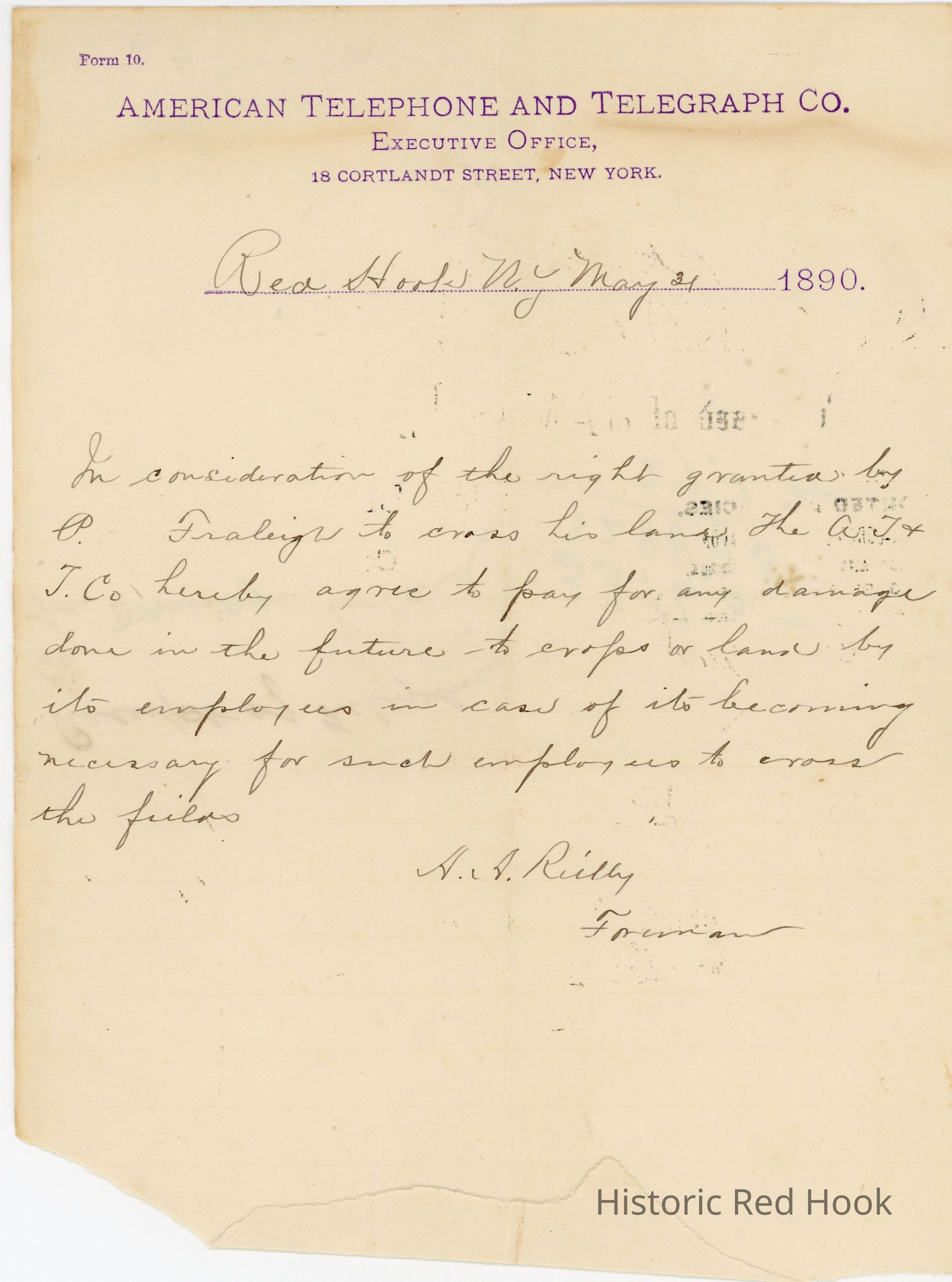 A note from the foreman of the American Telephone & Telegraph Co., stipulating that the company will be responsible for expenses incurred by employees on the land of P. Fraleigh dated May 31, 1890.Relationships