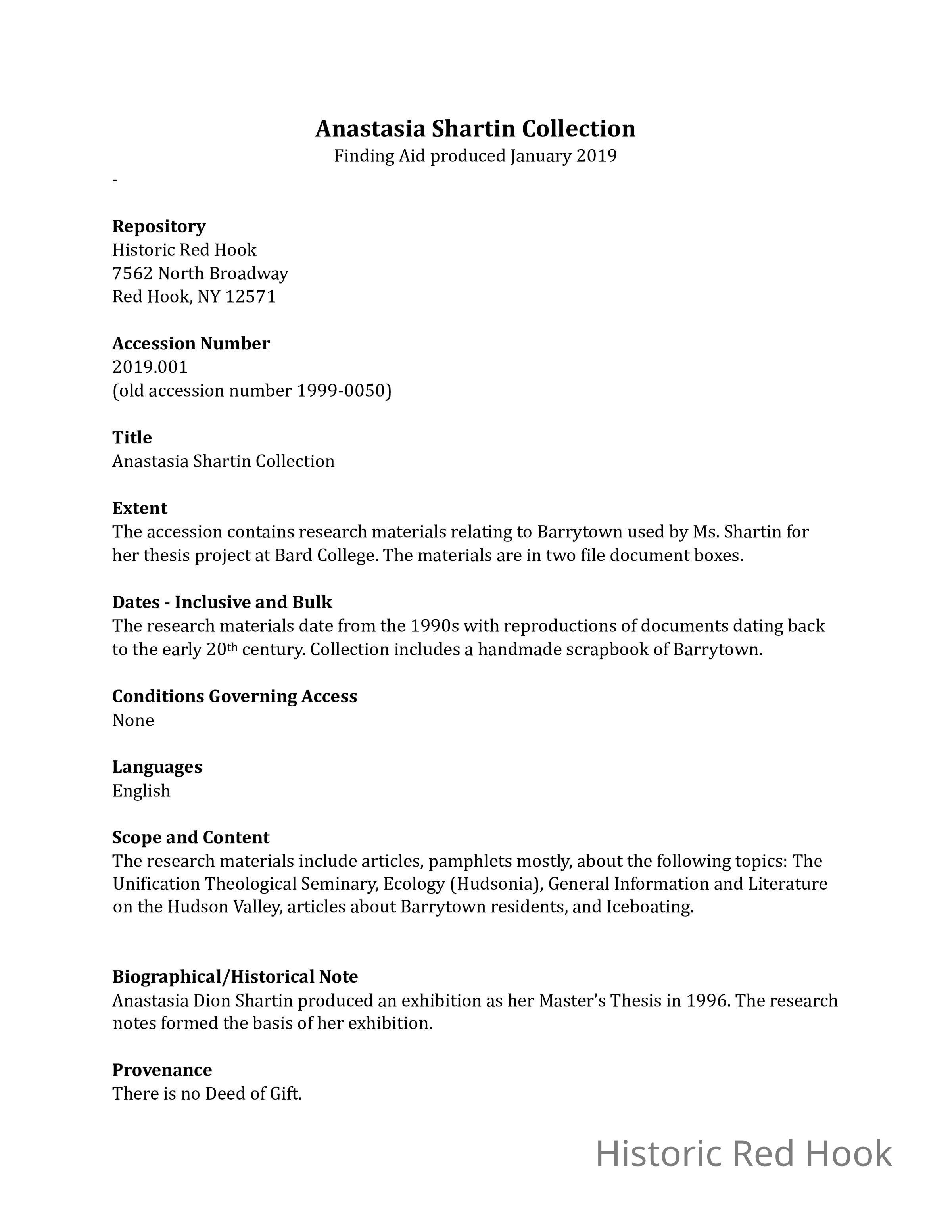 Anastasia Shartin Barrytown Collection - Finding AidEntry/Object ID