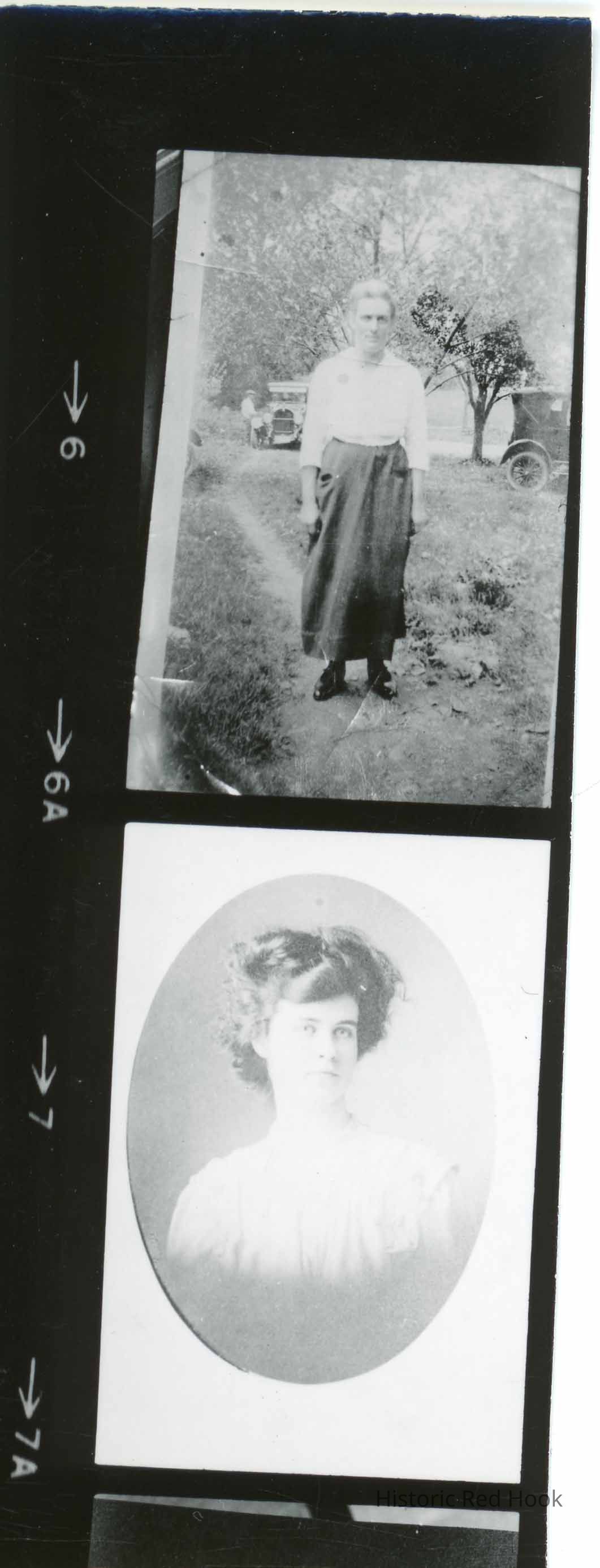 Strip images (2) of a young woman identified and "Strawberry Ann" Coon - one iamge an oval portrait and the other pictured standing near a road.Photograph Details