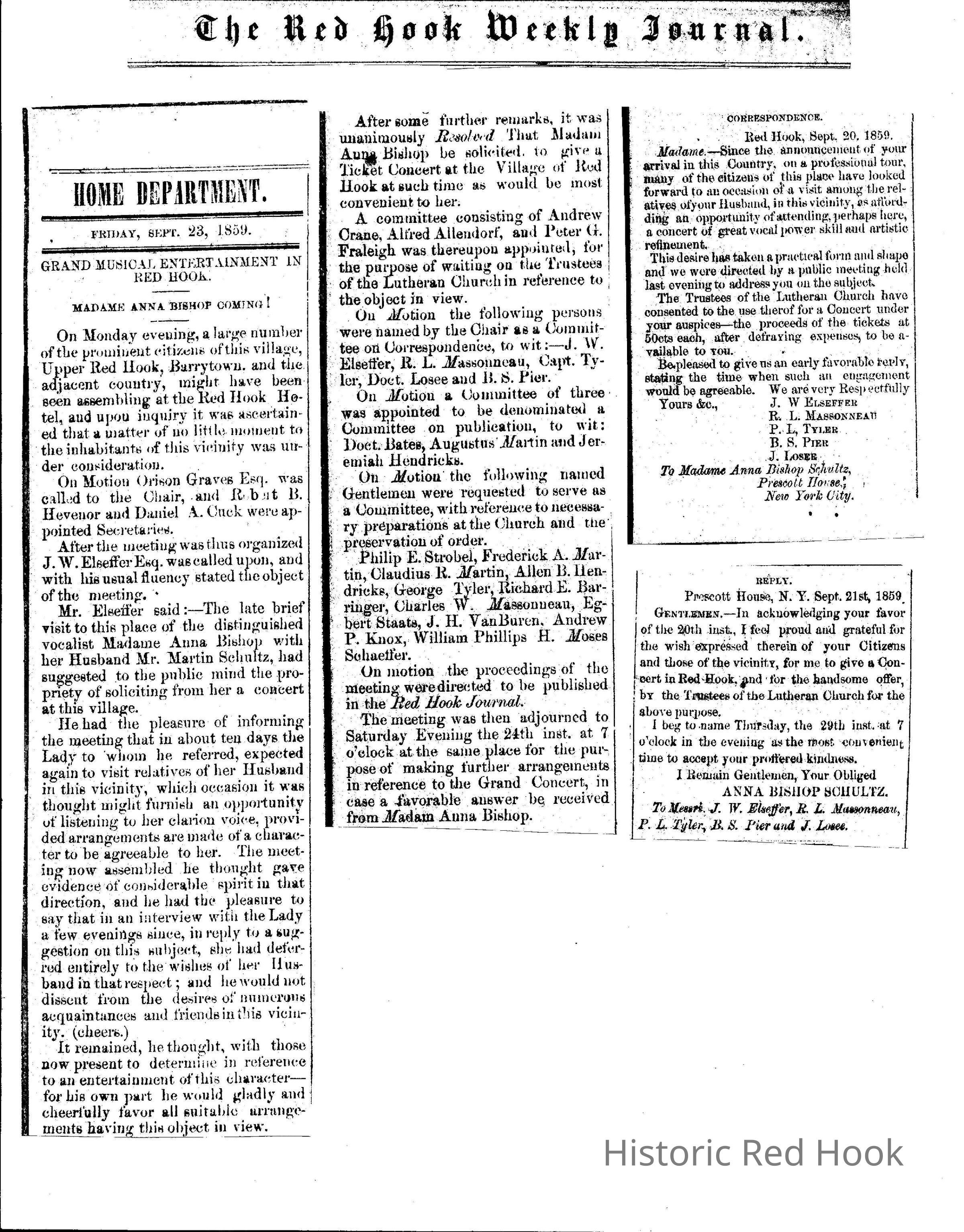 Clipping from the Red Hook Weekly Journal, Sep 23, 1859 announcing upcoming concert by Madame Anna BishopRelationships
