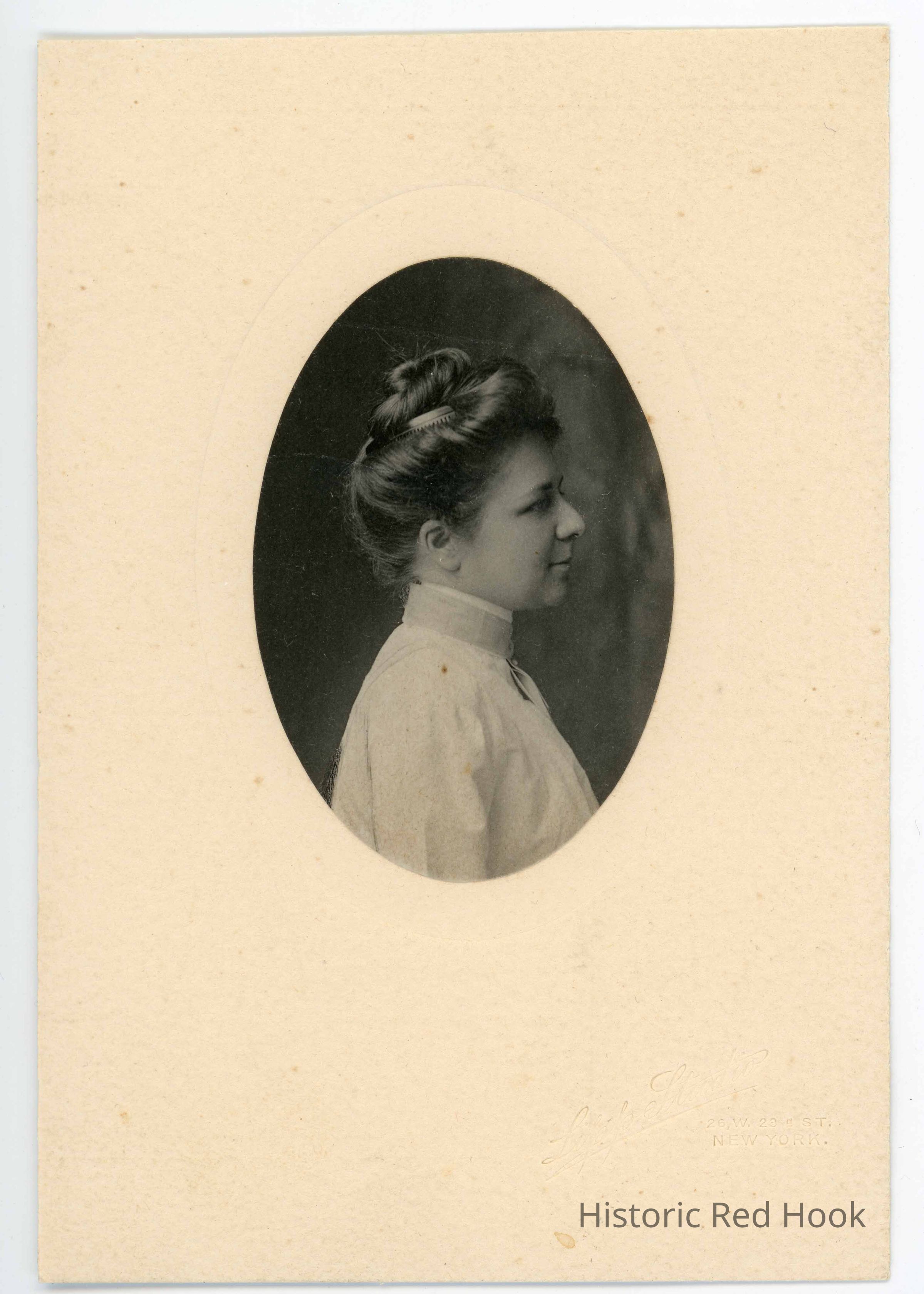 Profile head and shoulders portrait of a young woman taken at Lipp Studio, 26 W. 28 St. New York identified as Anna Clark.Photograph Details
