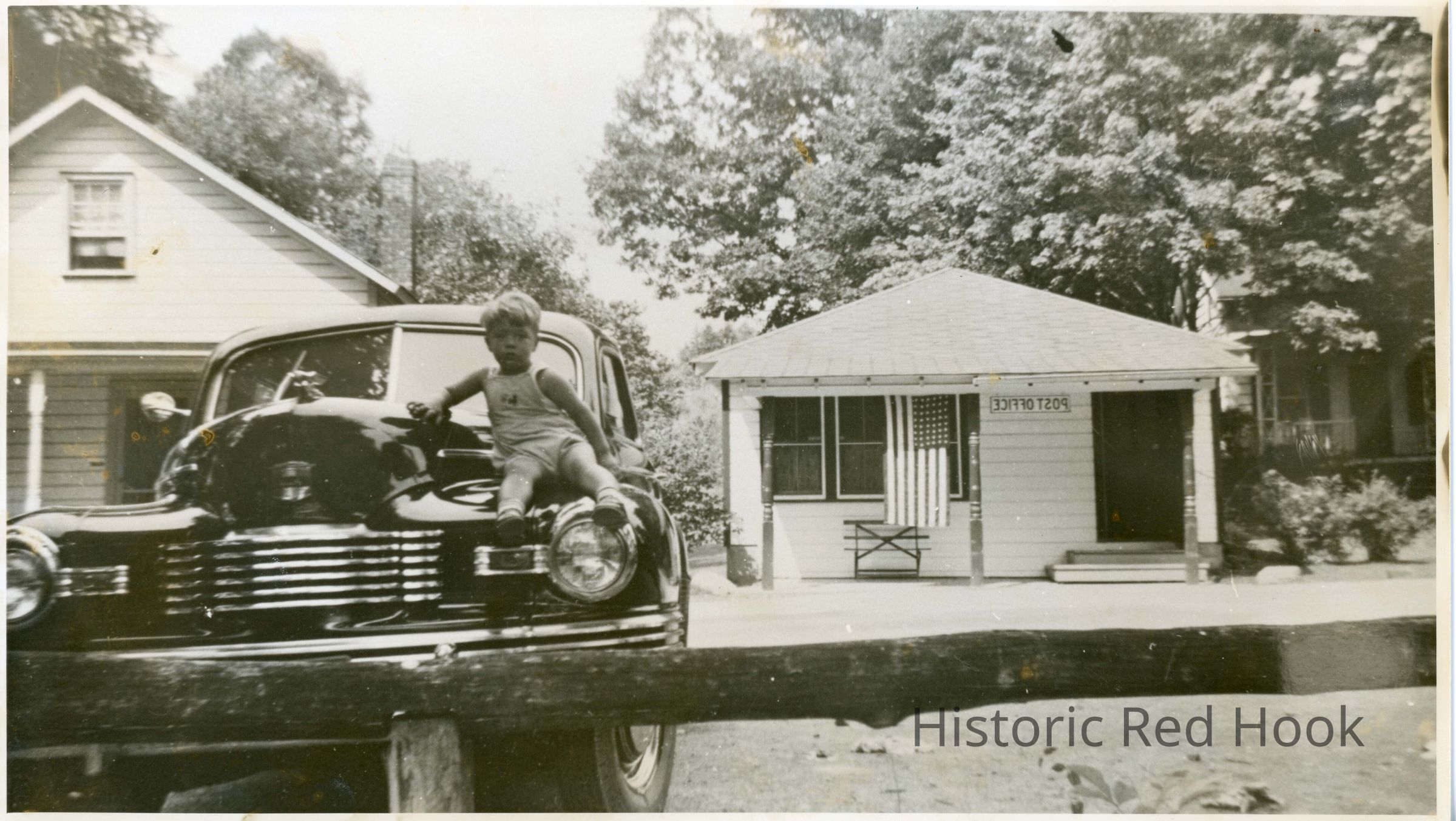 Annandale post office with boy sitting on hood of car in front. Photo is printed backwards.