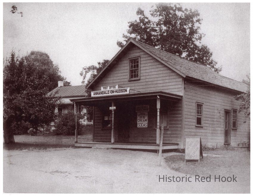 Annandale post office exterior. Sign says "Post office, Annandale-on-Hudson" and there is an 'ice cream, sodas' sign on the wall under the porch roof. 1914 written on photocopy.Collection
