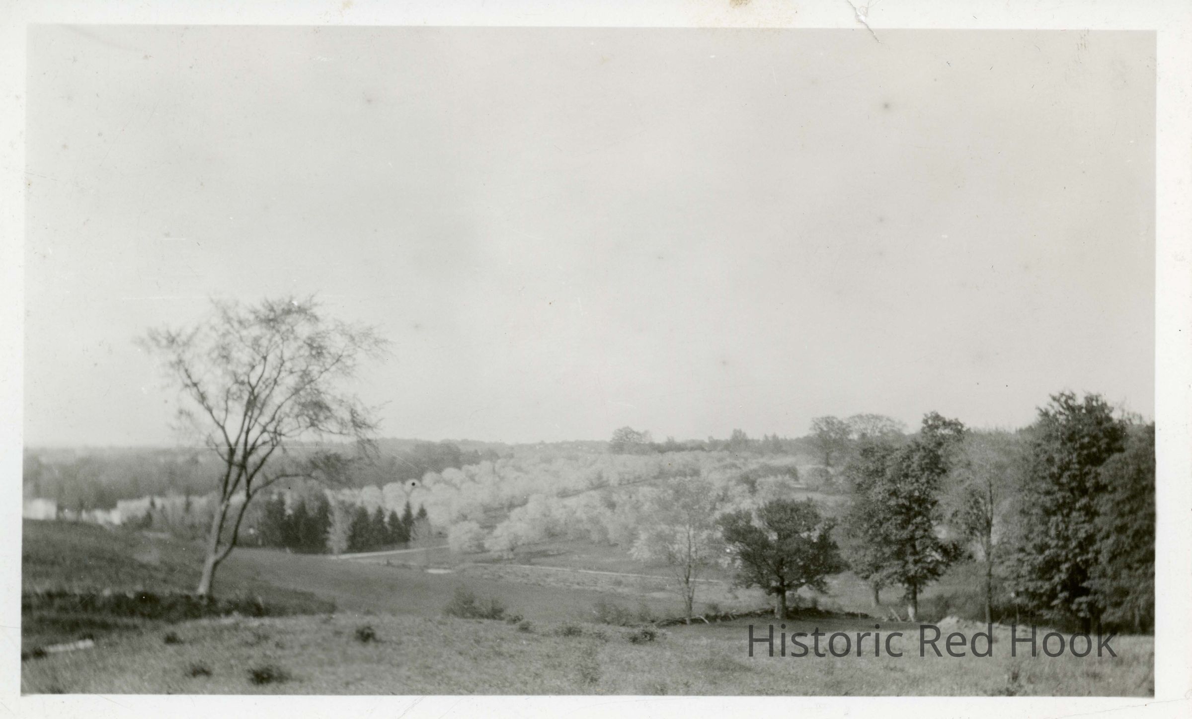 A view of an apple orchard in apple bloossom time, circa 1933.