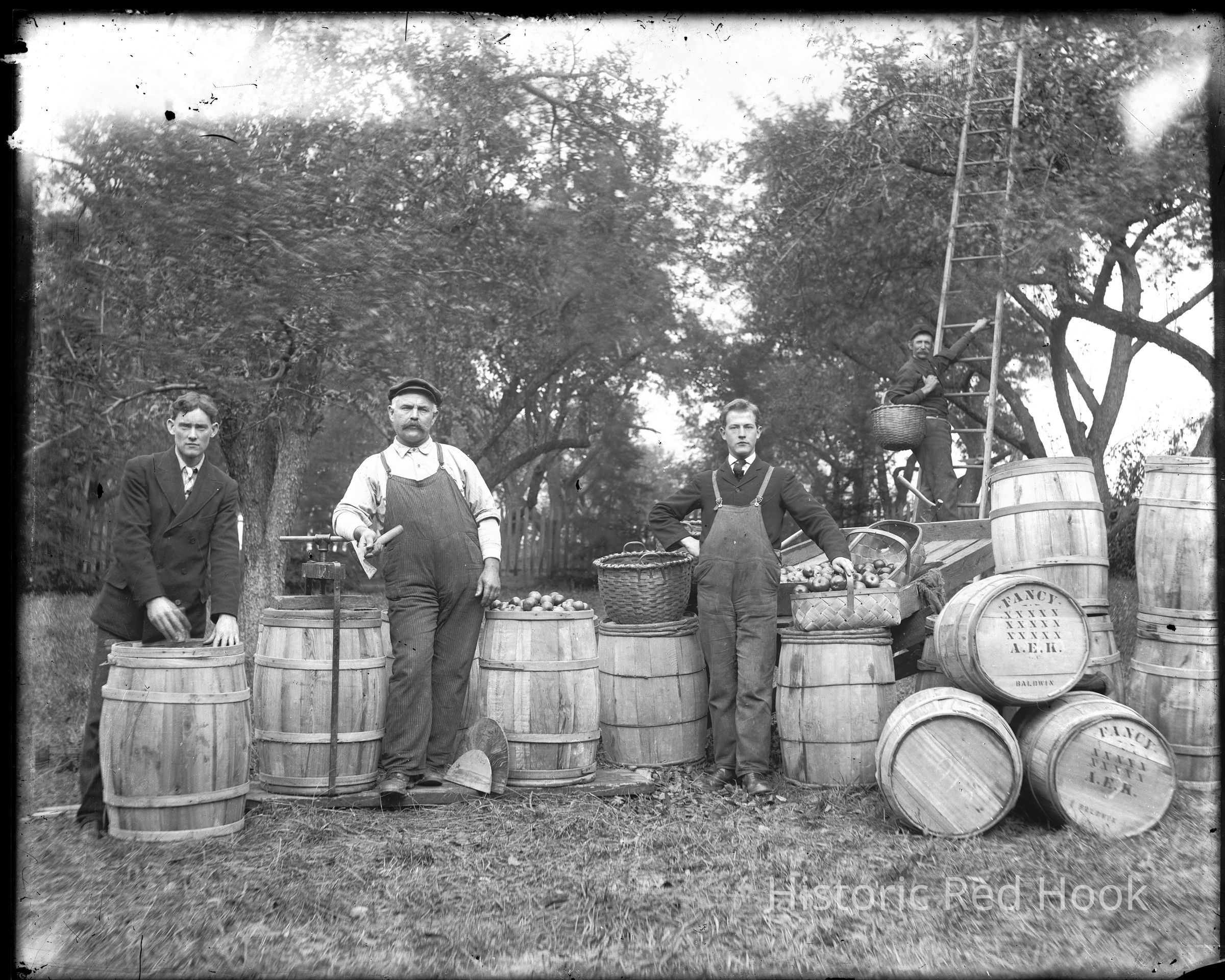 Apple harvesters posing with apple barrels on apple farm in Tivoli, N.Y., west of 9G, south of Red Church. circa 1900. Edwin Hoffman Pitcher is on the right wearing a tie.Photograph Details