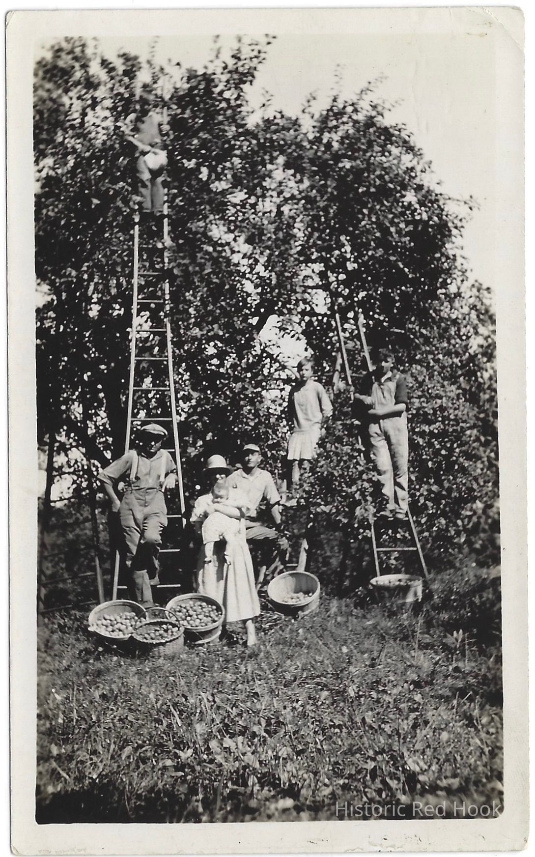 Family and workers harvesting apples on tall ladders, Henry Vogel, later Walter Vogel (his son) farmPhotograph Details