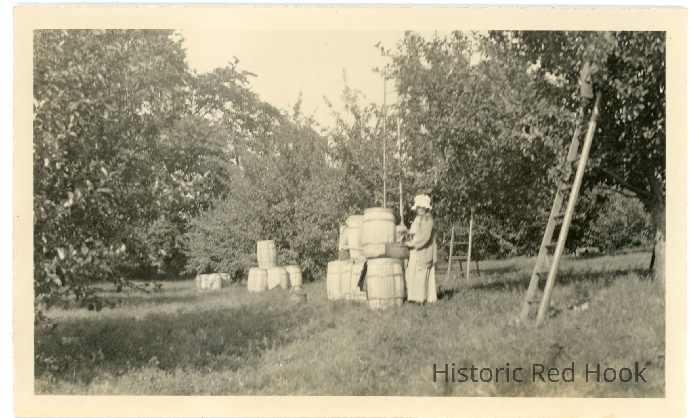 A lady in a long dress and large hat is standing in the apple orchard by stacks of barrels.
