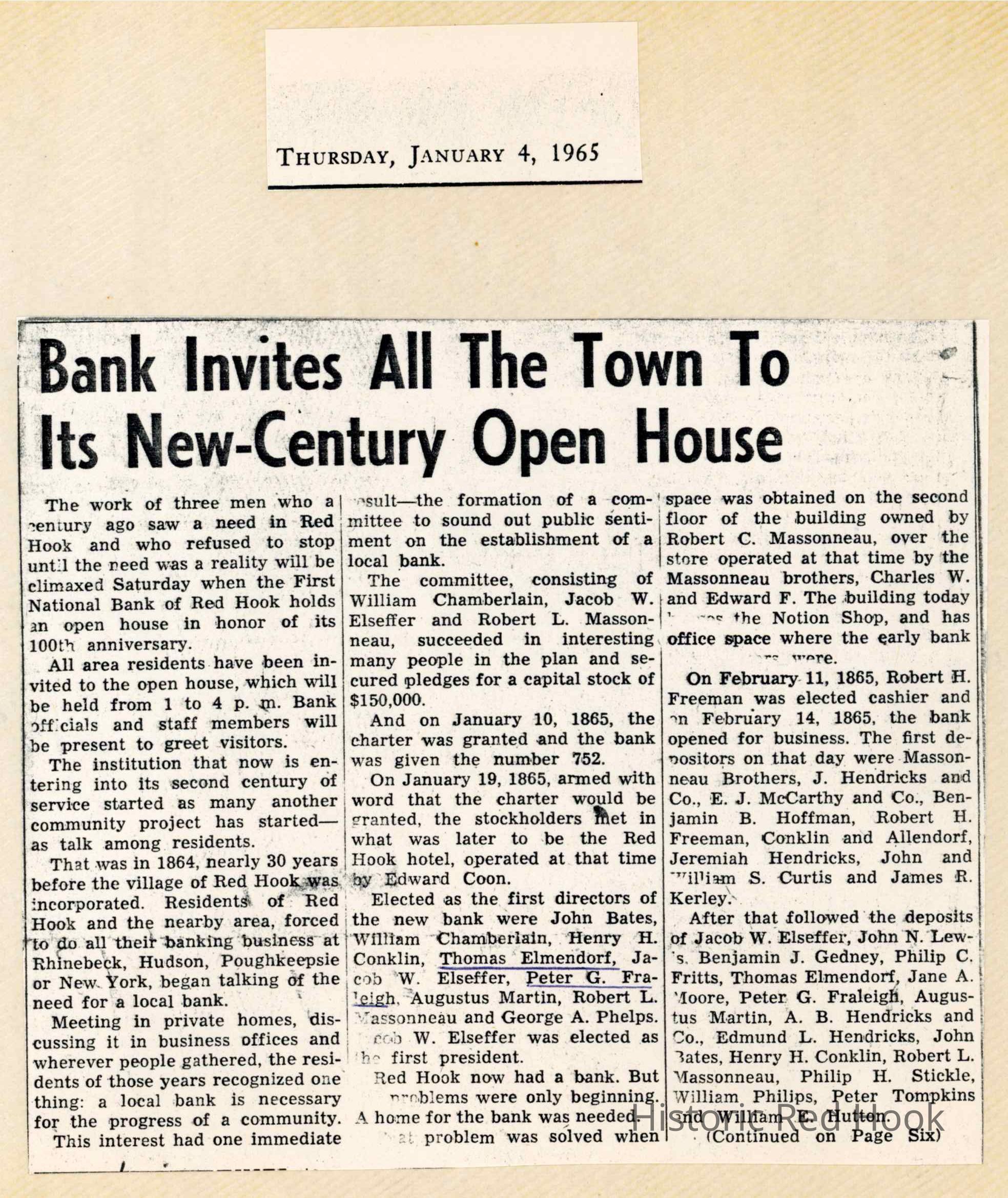 Article on 100th anniversary of First National Bank, 1965, with the names of Thomas Elmendorf and Peter G. Fraleigh underlined.