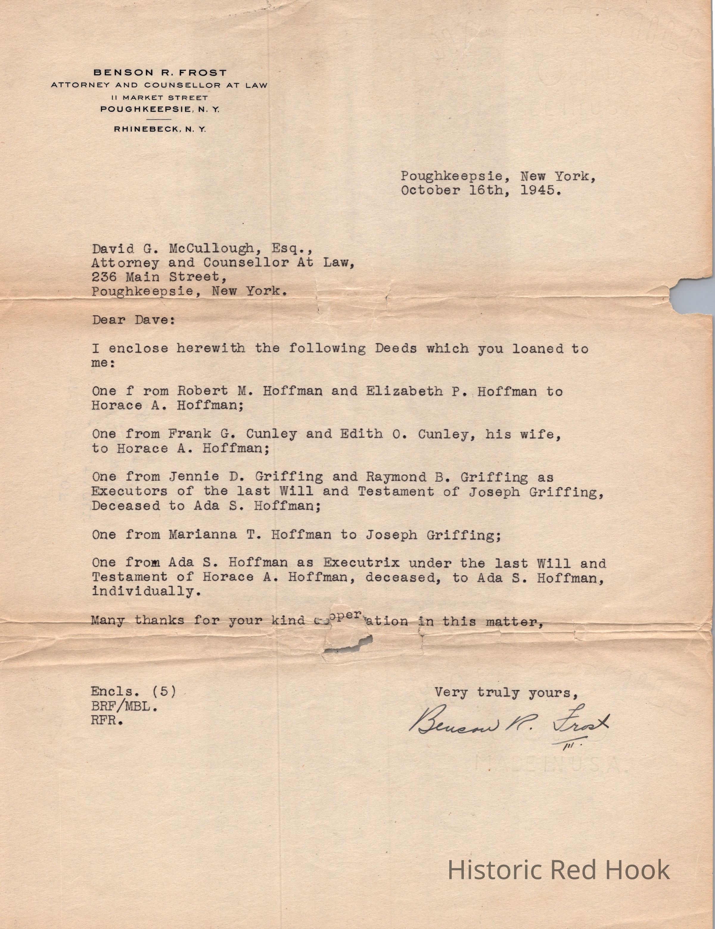Letter from the Benson R. Frost that accompanied five deeds returned to David G. McCullough, Esq. in 1945.