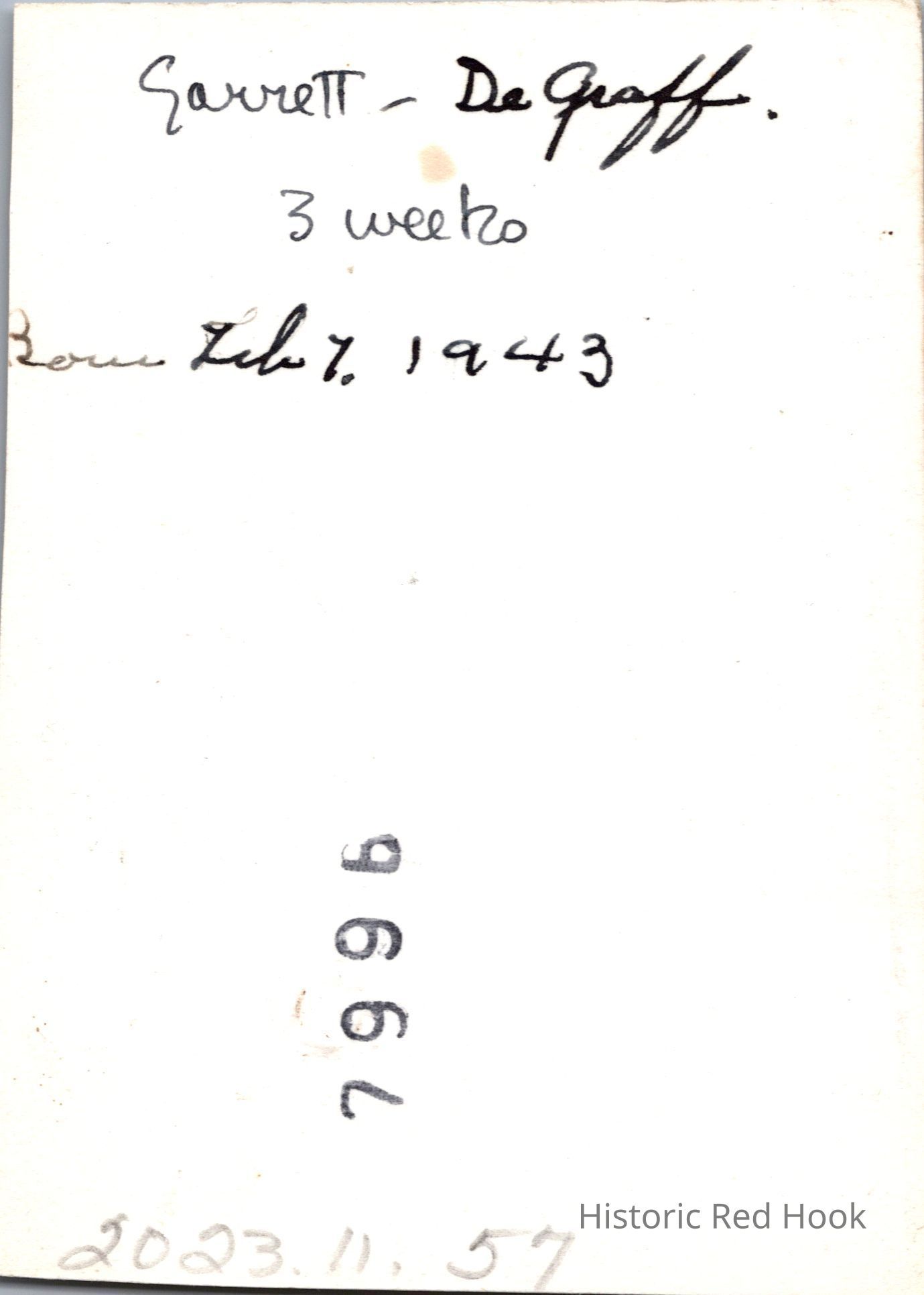 Baby in bassinet identified as Garrett DeGraff at three weeks old. born Feb 7, 1943Photograph Details