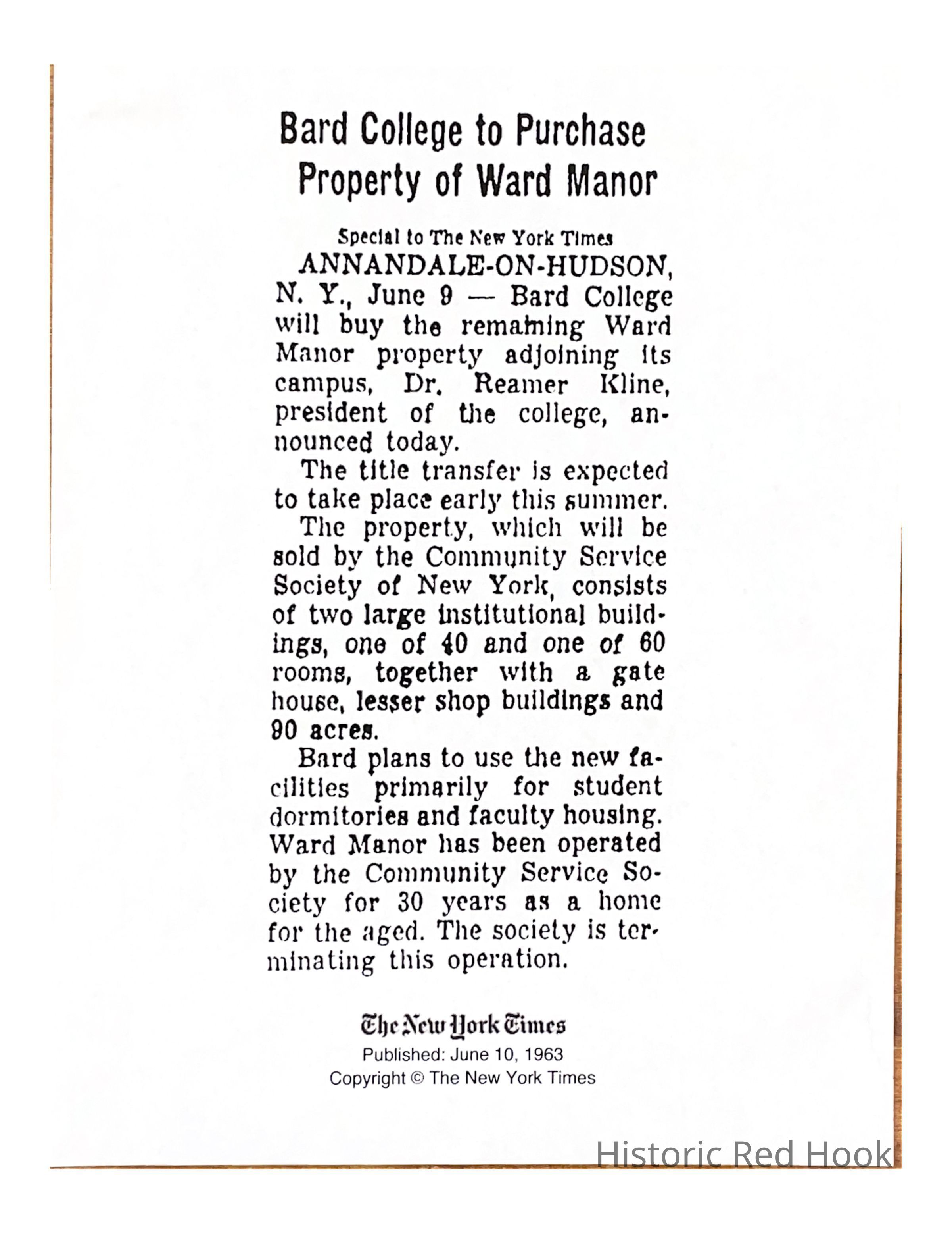 Bard to Purchase Ward Manor clippingEntry/Object ID