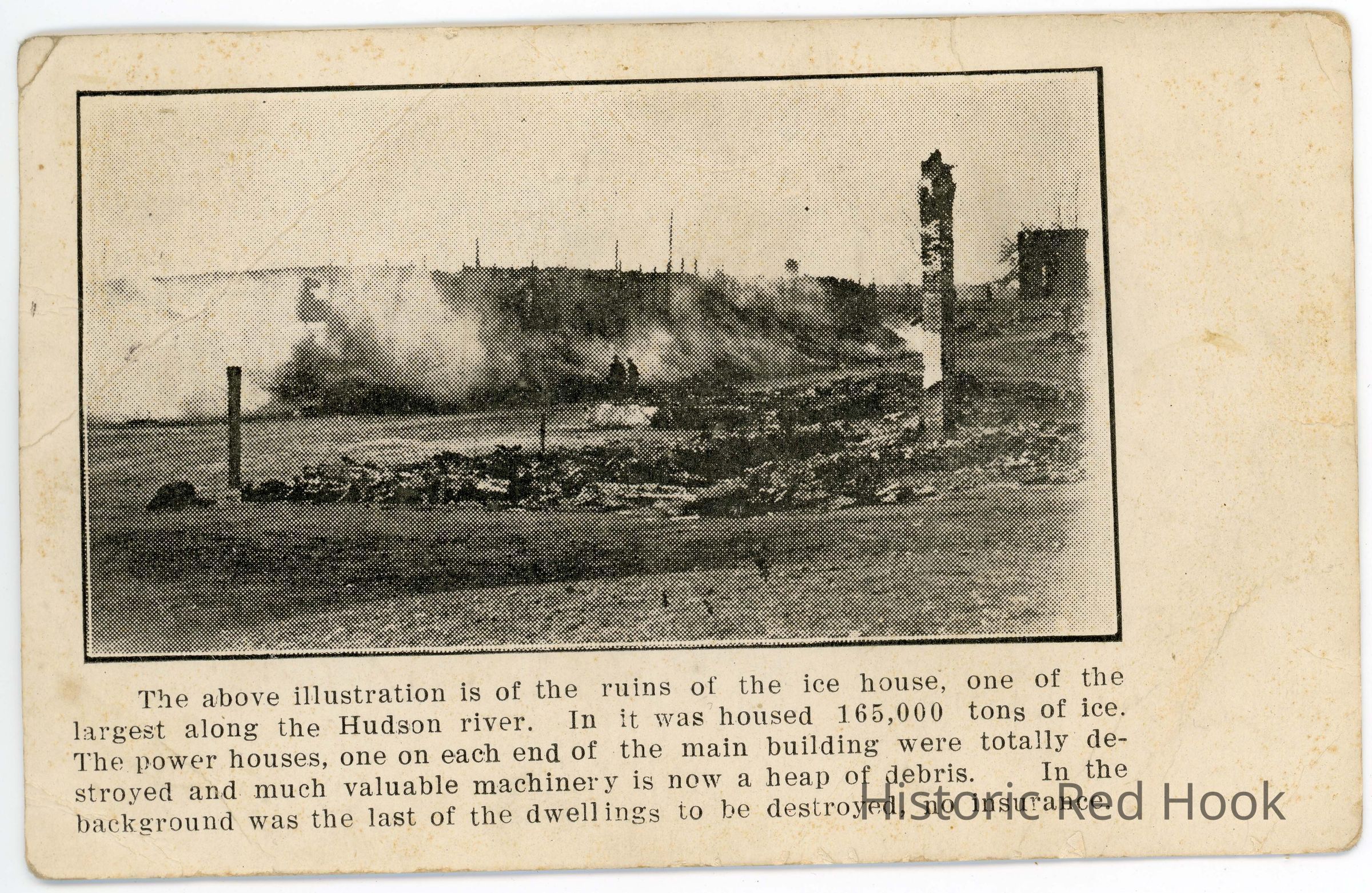 The Ice House was one of the largest on the Hudson River. It Housed 165,000 tons of ice. The power houses, one on each end of the main building, were totally destroyed and much valuable machinery is now a heap of debris. In the background was the last of the dwellings to be destroyed. There was no insurance.Collection