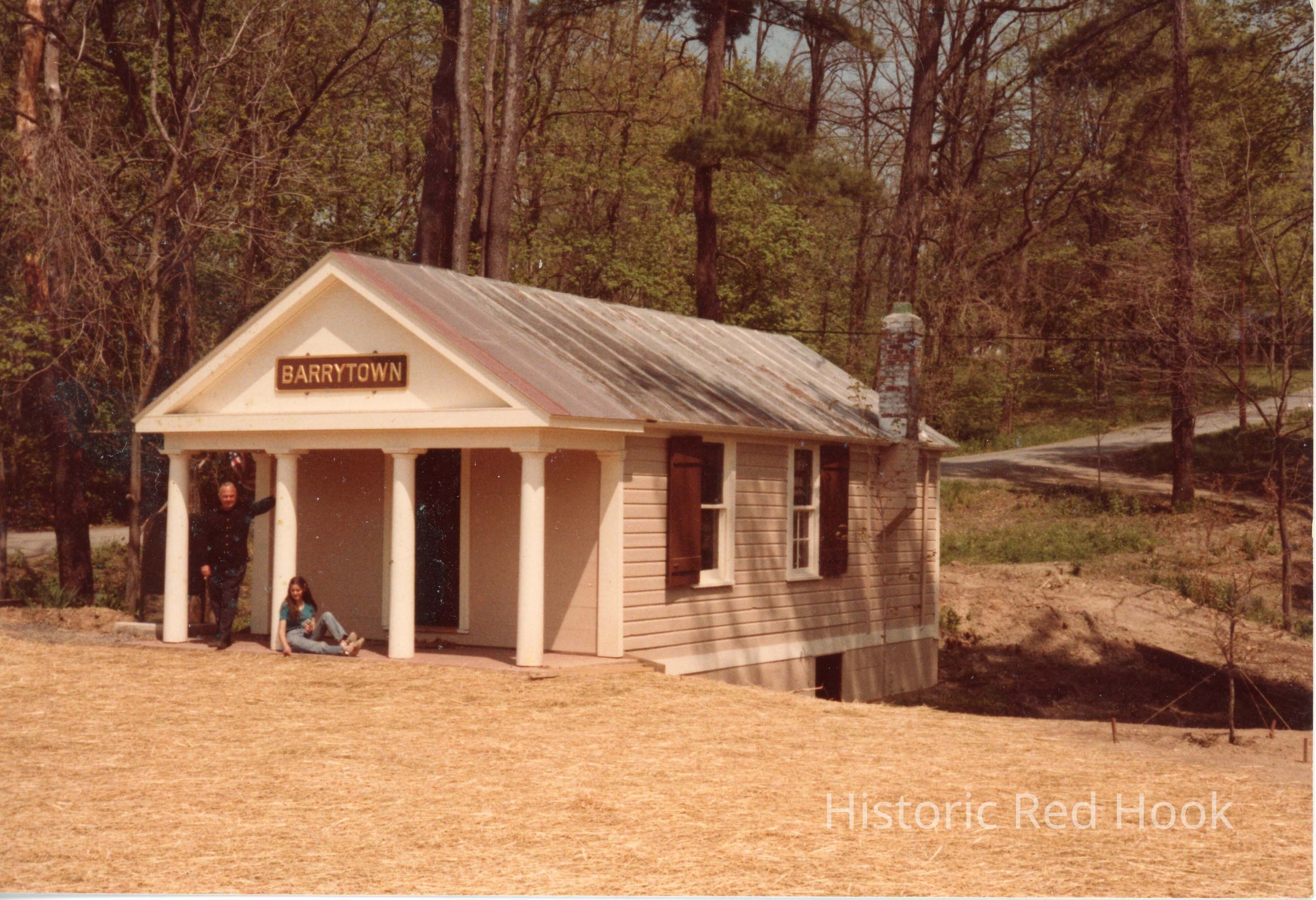 Color print - view of front of Barrytown Post Office building with a man standing in front and a girl sitting against a column. .Photograph Details
