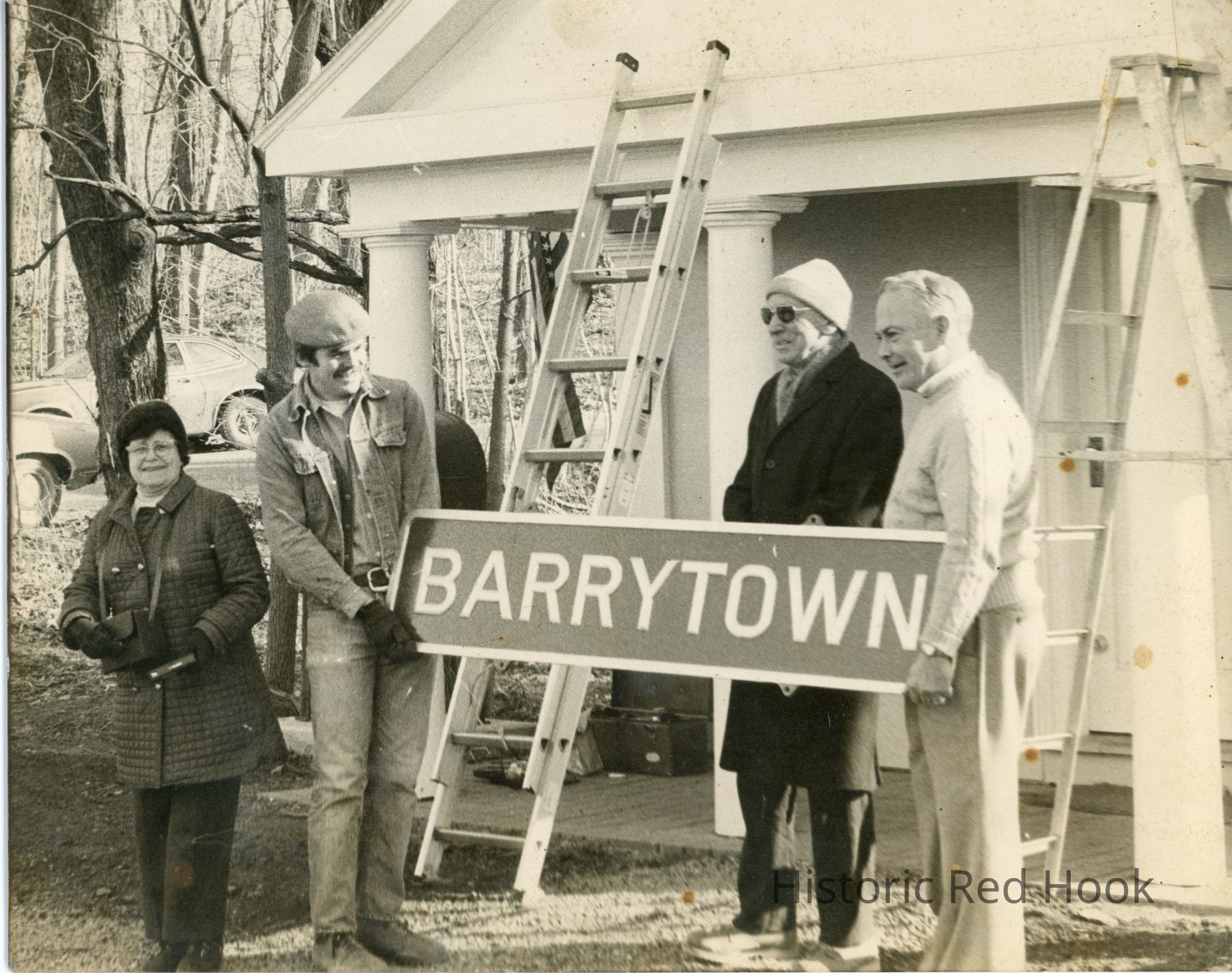 View of front of Barrytown Post Office building with four people standing in front with a ladder, holding the 'Barrytown' sign. Stamped on back 'Noon Rock, Station Hill Road, Barrytown, NY 12507. L-R, Hazel Scism, David Hoffman, Allen Porter, Gordon Baker on right.Photograph Details
