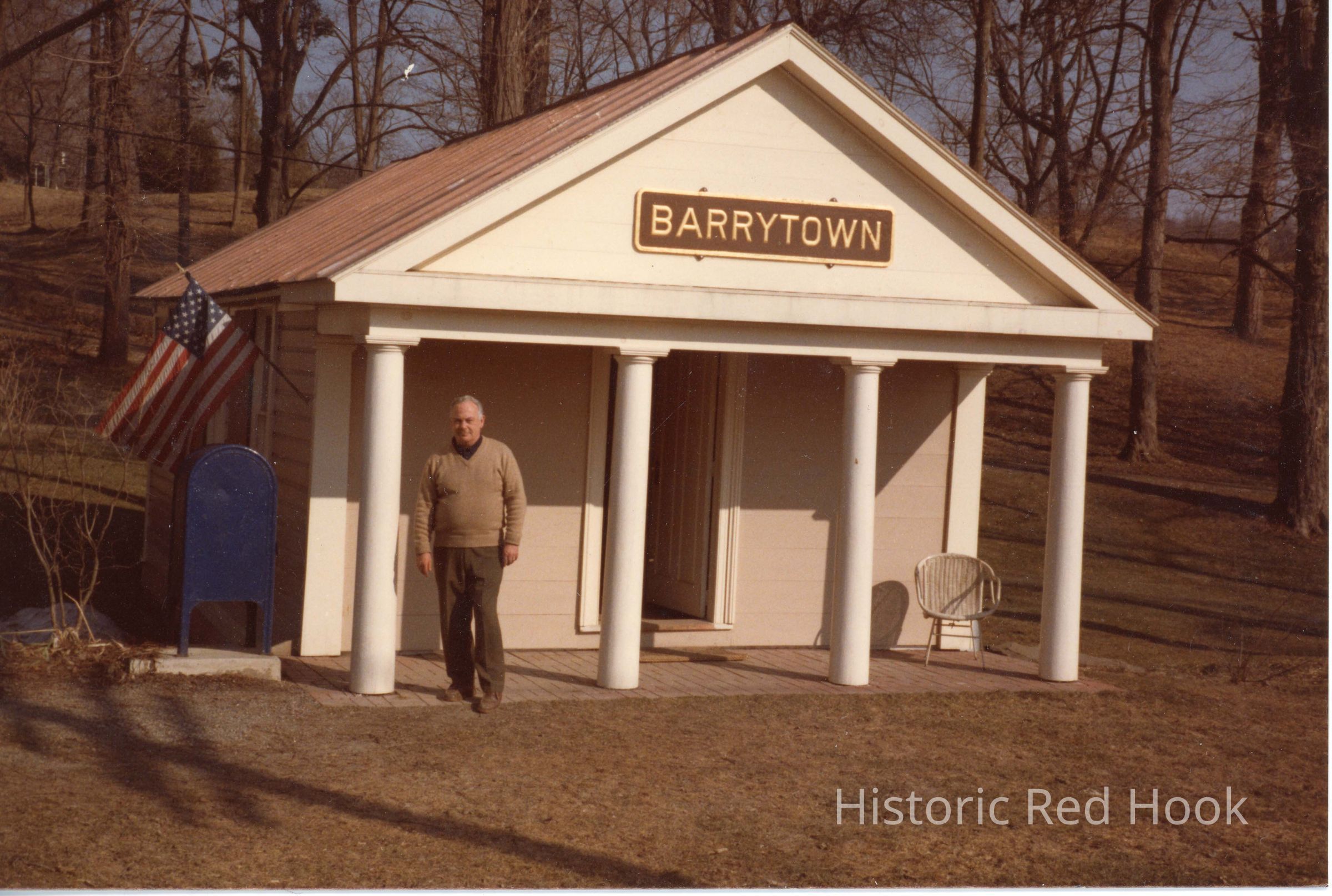 Color print - view of front of Barrytown Post Office building with a man standing in front.Photograph Details